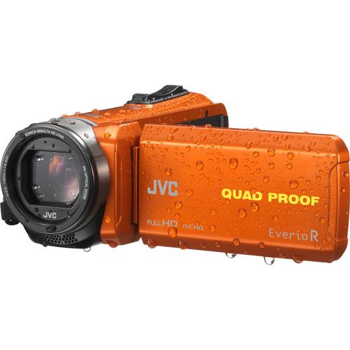 The orange JVC Everio GZ-R440DUS Quad-Proof HD Camcorder records 1080i60 HD AVCHD video at bit rates up to 24 Mbps. Designed with JVC's rugged Quad-Proof camera body, the Everio GZ-R440DUS is built to capture your adventures, no matter what the weather. This rugged camcorder is waterproof down to 16', shockproof from falls up to 5', dustproof, and...