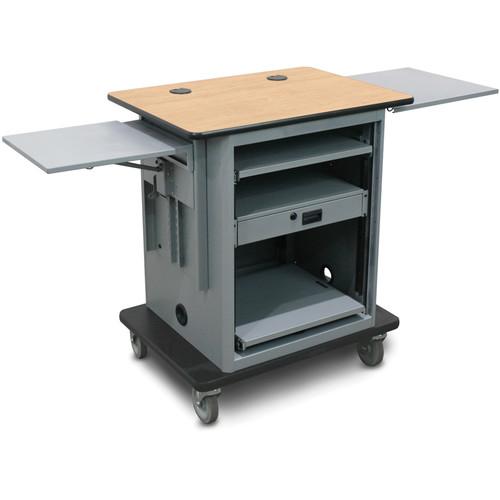 The Silver model Instructor Series Presentation Cart from Marvel functions as a teacher's station, supporting both A/V and desk functions with a small footprint. The "Instructor" is designed to support today's classroom needs and safety requirements. The cart is constructed of 18 and 22 gauge welded steel, and is equipped with a no-tip safety base...