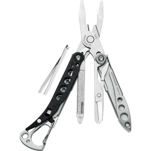 The Leatherman Skeletool Multi-Tool features stainless steel construction and seven tools including the following: a 2.6" 420HC combo straight/serrated locking blade, two sets of pliers, two double-sided screwdriver bits, and two sets of regular/hard wire cutters. Its replaceable pocket clip and carabiner clip keep it within reach. The Skele...