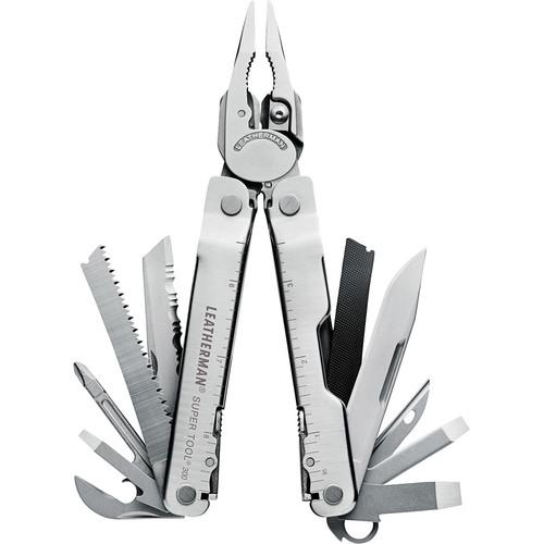 The Leatherman Super Tool 300 Multi-Tool features stainless steel construction, a stainless finish, and a set of 19 locking tools that includes: two 3.2" 420HC straight/serrated locking blades, two sets of pliers, four screwdrivers, two sets of replaceable 154CM regular/hard-wire cutters, and a stranded wire cutter. Additionally, there's a g...