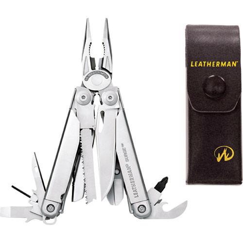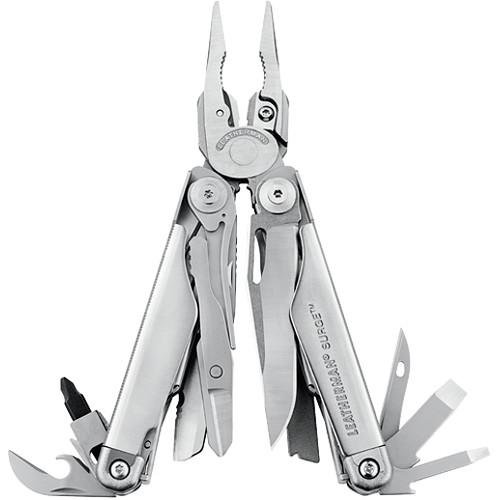 The Leatherman Surge Multi-Tool features stainless steel construction with a stainless finish and 21 tools including the following: Two 3.1" 420HC straight/serrated blades, blade exchanger to change the wood/metal file and separate diamond-coated file, two sets of pliers, electrical crimper, double-sided #1-2 Phillips/flat tip bits, and regul...