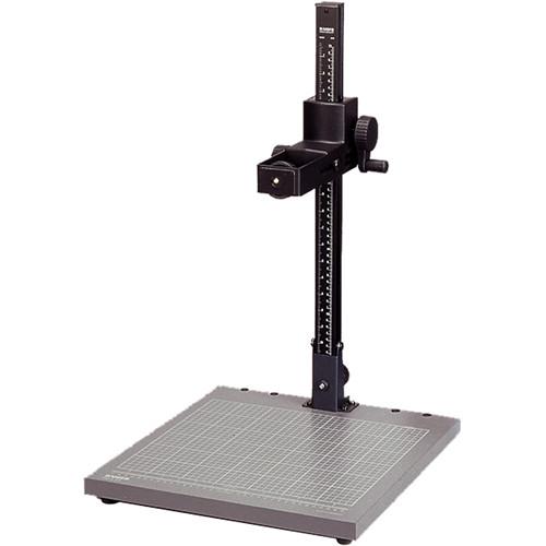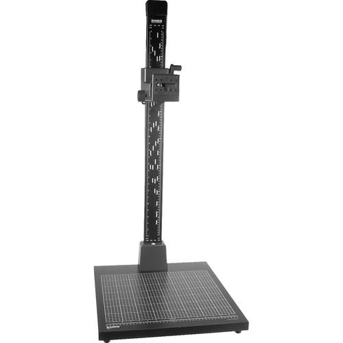 The RS 2 CP Copy Stand from Kaiser is a portable camera-ready copy stand designed for producing precise duplicates of printed matter. The stand features a non-reflective matte gray baseboard which measures approximately 15.7" in width by 16.5" in length and is covered with a white document alignment grid. The camera is supported by a black anodize...