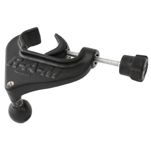The RAM Yoke Clamp Base with 1" Rubber Ball and 1/4-20" Tap from RAM MOUNTS includes a 1/4-20" thread in the back side of the 1" ball. The clamp fits a rail diameter from 0.625" to a maximum of 1.25". The 1" rubber ball is at a right angle to the plane of the mount so when connected to a rail, the ball sits parallel to the rail. UPC: 793442903830 ...
