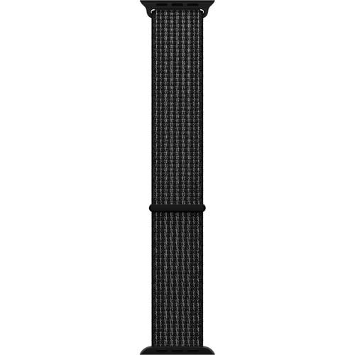 Personalize your 38mm/40mm Apple Watch, Apple Watch Sport, or Apple Watch Edition with an Apple Watch Nike Sport Loop Band in black. This band is made from double-layered woven nylon with dense loops facing your skin for improved cushioning and moisture wicking. The woven nylon contains reflective threads designed to shimmer when light hits them,...