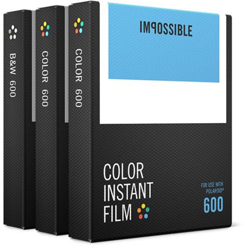 Bundling three packs of instant film to get you shooting, the 600 Triple Pack from Impossible gives you 24 total exposures for I-type and Polaroid 600 cameras. Included in this kit are two eight-exposure packs of color film and one eight-exposure pack of black and white film, and all of the film features classic white square frames. Color Instan...