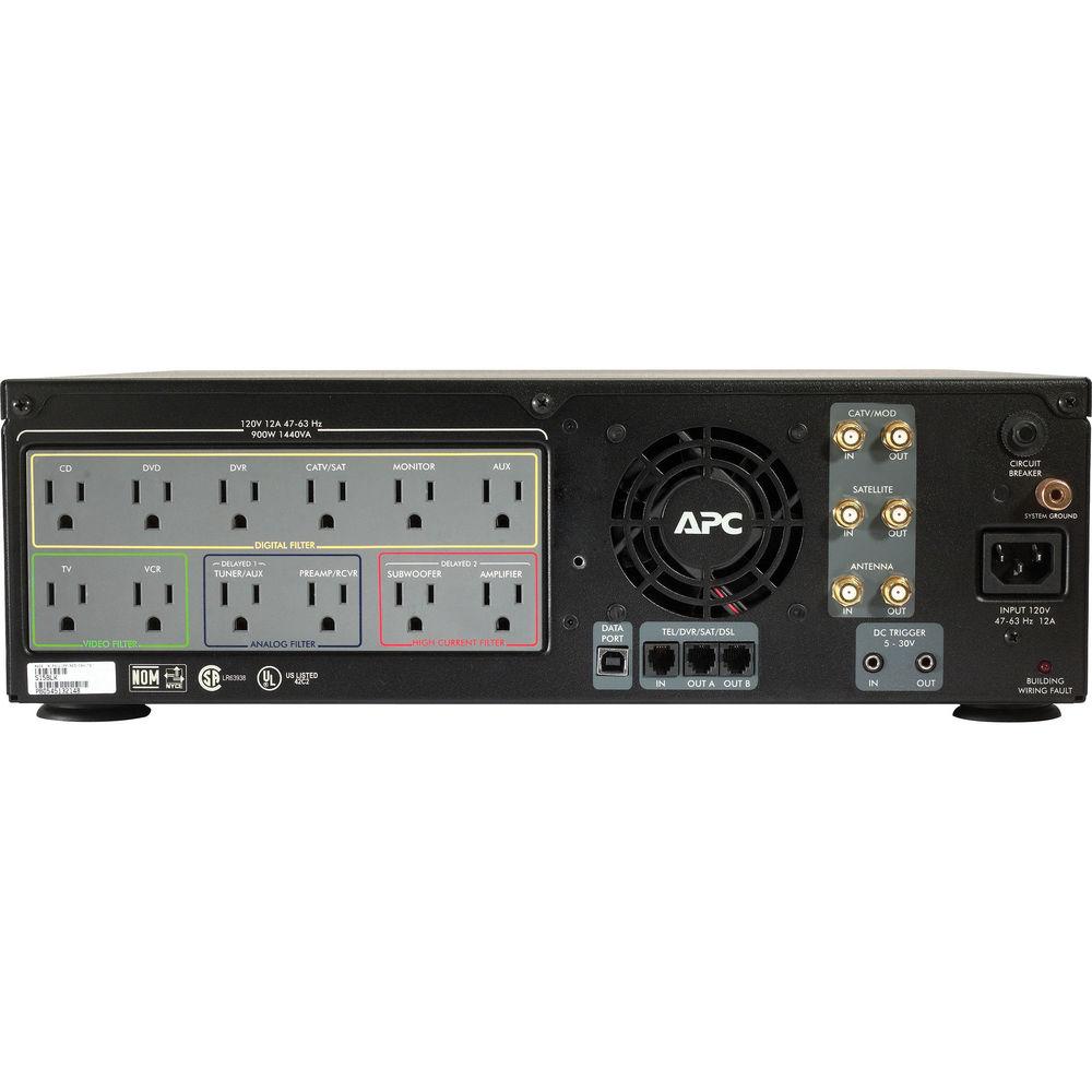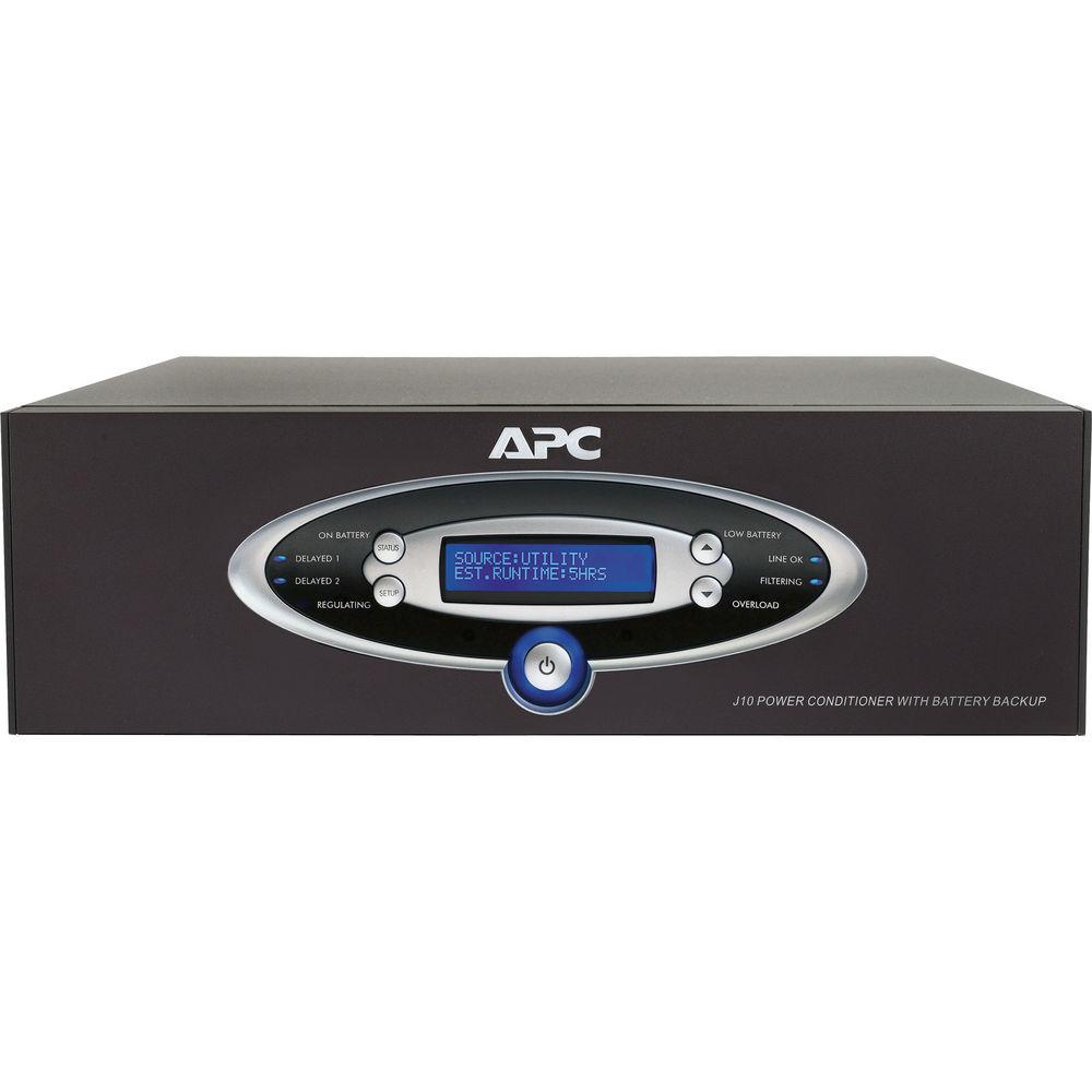 Product description The APC J10 12 Outlet Power Conditioner with Battery Backup offers excellent value protection for home theater systems. Surge protected outlets keep all components safe from damaging surges, spikes and even lightning. Noise filter banks reduce electromagnetic and radio frequency interference that can harm picture and sound quality. Automatic Voltage Regulation (AVR) keeps voltage levels steady to ensure safe operation during low and high voltage conditions. Battery backup power keeps the home theater on, protects expensive TV bulbs and saves recordings stored on a DVR when the power goes out. The J10 provides battery backup power to maintain uninterrupted power for the home theater in the event of a power blackout. Battery backup power not only prevents interruptions in your entertainment, it also prevents lost pre-sets, lost information stored on a Digital Video Recorder (DVR), damaged hard drives, and premature projector bulb wear and tear. Sequenced turn-on and off ensures that connected equipment is powered-up/down in the proper order and with the right amount of delay between the stages. It allows you to program a delay into the sequence between 0 and 10 seconds. This feature helps to eliminate any "popping" sounds coming from speakers when turning on the system. This delay feature also eliminates transients that can affect connected components, e.g. digital projectors. - Surge Protection