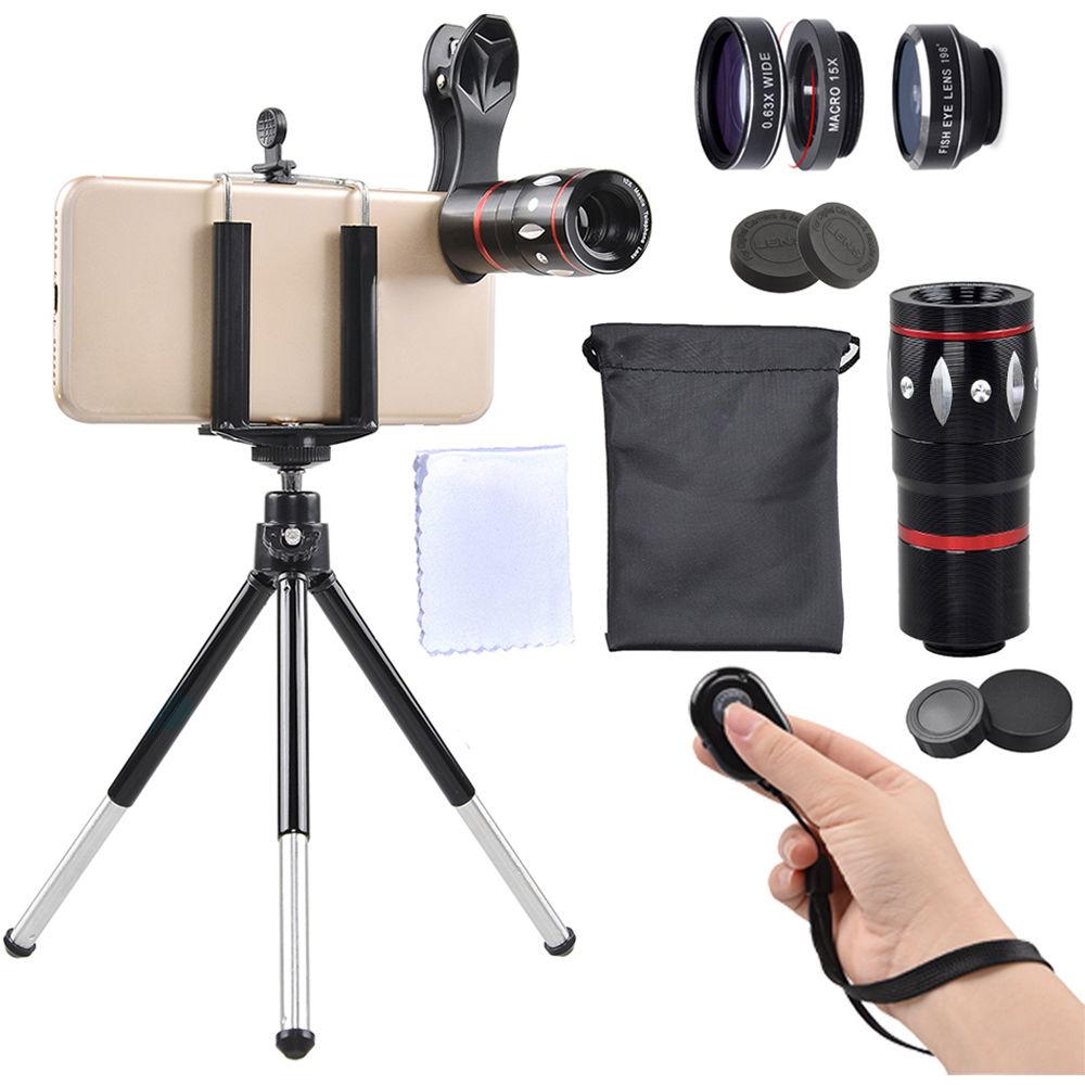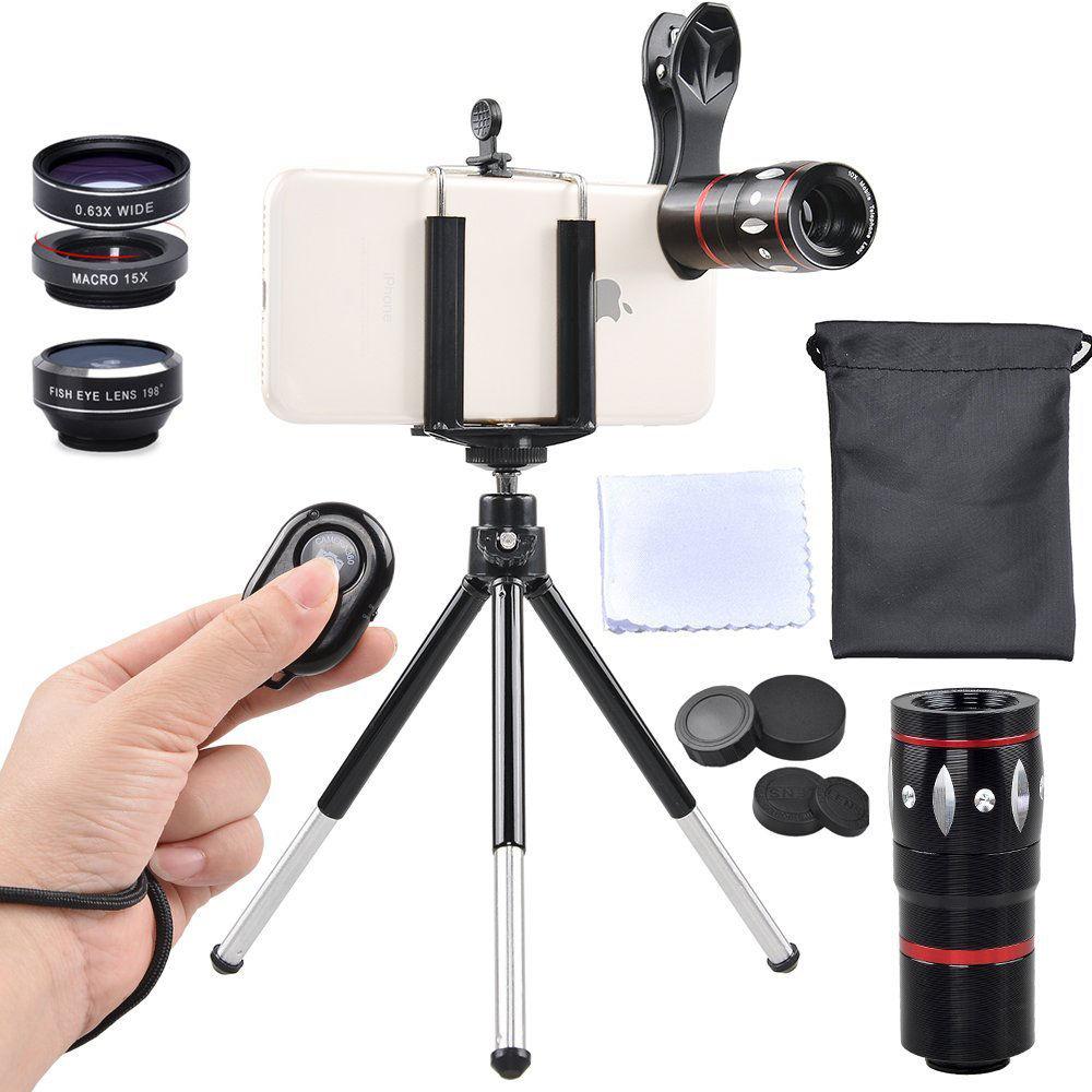 Product description The 5-in-1 Smartphone Lens Kit with Remote Shutter from Apexel bundles four lenses together, including a 10x telephoto lens, a 198° / 0.28x fisheye lens, a 0.63x wide-angle lens, and a 15x macro lens. Designed for Apple and Android devices, such as the iPhone 7, 6S, 6S Plus, 6, 6 Plus, 5S, and SE, Samsung S6, S6 Edge, S7, and S7 Edge, plus HTC, Sony, the LG G6 and G5 and more, also included is a tripod, a phone holder, a universal lens clip, a Bluetooth camera shutter remote with an operating distance of up to 30', a cleaning cloth, four lens covers, and a waterproof bag. Protection is provided by a limited 30-day warranty. General Features - Enhanced Photos & Videos