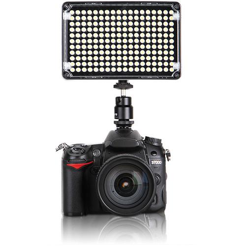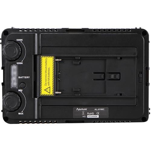 Product description The Amaran H198C from Aputure is an on-camera LED light that utilizes 198 LEDs with a CRI of 95+ to deliver bi-color illumination with high color accuracy. The light produces a 60° beam angle with a brightness of 420 - 435 lux at a distance of 3.3'. A step-less dimming dial is provided on the back of the unit for adjusting light output, and you can adjust the color temperature precisely by turning the kelvin wheel. The light can be powered by either six AA batteries or an optional Sony NP-F/FM/QM/FP/FH/FV type battery, with four LED indicator lights on the back of the unit displaying the remaining battery life. To create a larger light source, up to nine H198C panels can be attached together using extension slots on all four sides of the light. The slim and frameless design of the light means that when multiple lights are connected, there are no gaps or light leaks. One extension attachment piece comes included, which also serves as a 1/4"-20 adapter. Also included are a swivel shoe mount adapter for camera mounting and a diffusion filter. - Key Features