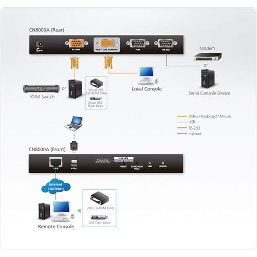 Product description Multi-Monitors: Maximizing Multitasking Read More szbtzxdudcqdzybzysbafxatyde The ATEN CN8000A Single Port VGA KVM over IP Switch features resolutions up to 1920 x 1200, LUC (Laptop USB Console) for easier KVM access, user-friendly local console OSD and virtual media function without additional cable. It provides access control through over-IP for conventional KVM switches that do not have built in over-IP functionality. It allows system operators to monitor and access computers from remote locations using standard Web browsers or Windows and Java based application programs. The CN8000A connects to the Intranet either LAN or WAN simply by using an industry standard Cat 5e/6 cable, and is connected to a local KVM switch or server via a custom KVM cable. The switch uses the standard TCP/IP protocols for communications; it allows the connected server or KVM switch to be accessed from any computer over the internet - whether that computer is located down the hall, in other areas of the country or branch offices in other parts of the world. It has a dedicated RS-232 port for modem access or serial console management, a PON port to connect a ATEN PDU device and USB 2.0 virtual media capability. A Windows Client Viewer and a Java Applet Viewer are available for browser access, while Windows Client AP and Java Client AP programs are provided for non-browser GUI access. They allow IP connection and login from anywhere over the internet. Inclusion of a Java-based client ensures that the CN8000A is an independent platform, and is able to work with practically all operating systems. To meet advanced security requirements, the CN8000A's Virtual Media function allows a Smart Card / CAC reader on a local system to be mapped to a remote server. The CN8000A provides a fast, reliable, and a cost effective way to remotely access and manage widely distributed multiple computer installations. - Hardware