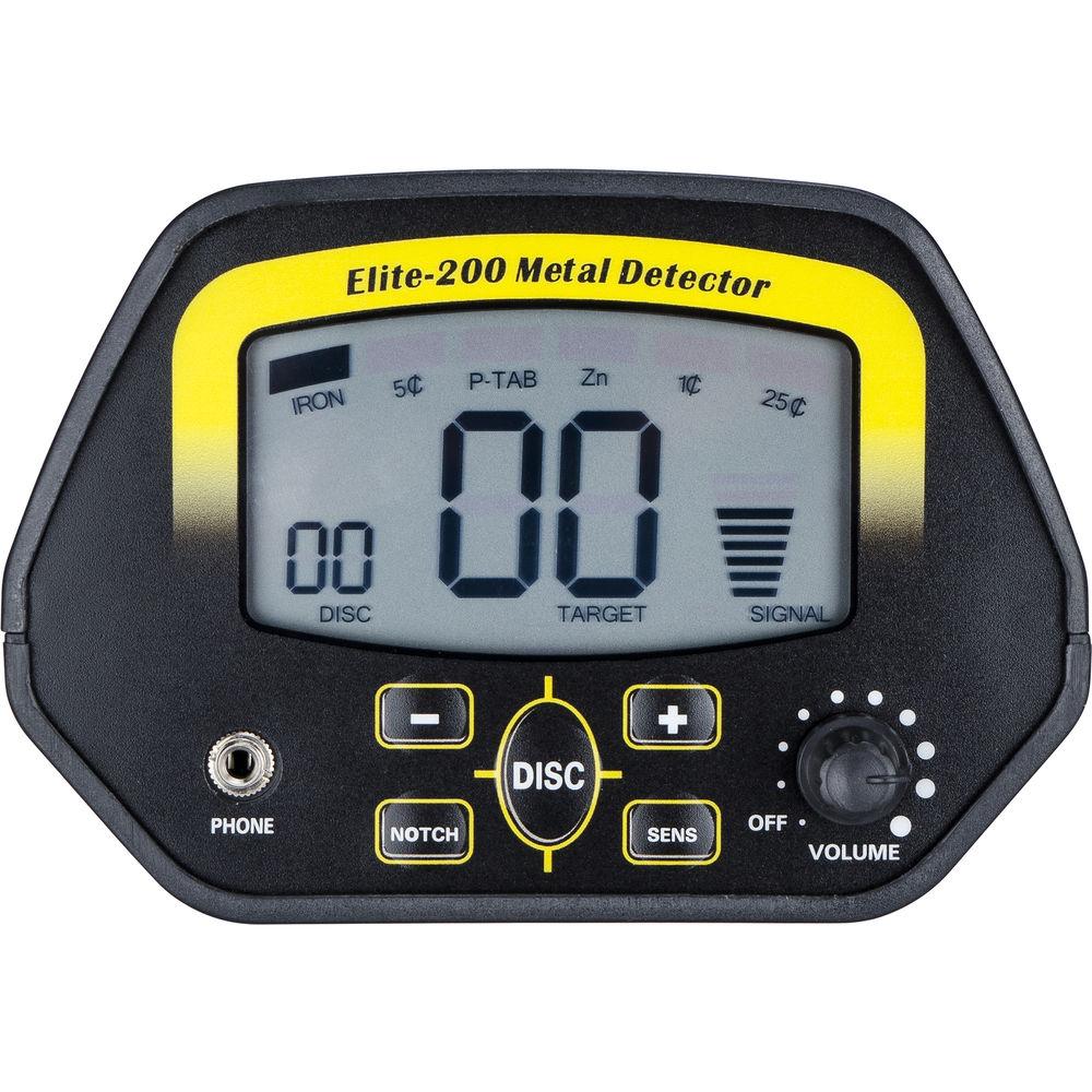 Product description The Pursuit-200 Metal Detector from Barska knows the difference between trash and treasure, so you won't waste time digging up bottle caps and nails while more important objects wait to be discovered nearby. Its LED display shows what a buried object is likely to be; you can search for specific types of objects with the Discriminate function, and ignore certain types with the Notch function. The Elite-200 is sensitivity-rated to find a quarter buried 8.7" deep. The detector has a built-in speaker, but there's also a 3.5mm jack for user-supplied headphones if you want to hear the detector's signal tones more clearly. The 10" search coil is sealed for water-resistance and can be used in shallow water. A low-battery indicator warns you when it's time for a fresh power supply. The detector's stem extends to 47" and is equipped with an arm rest for comfortable use, and the unit's controls, as well as a headphone jack and volume knob that are easy to reach. -