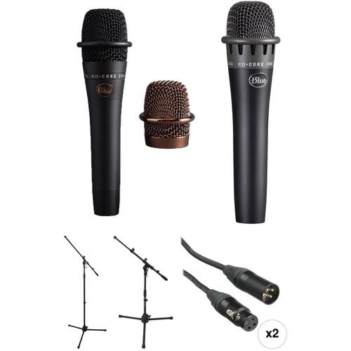 Product description The Blue enCORE 200 and enCORE 100i Microphones with Stands Kit from includes a black enCORE 200 handheld dynamic microphone with a proprietary, active-dynamic phantom power circuit, a black enCORE 100i dynamic instrument microphone, an Auray MS-5230F tripod microphone stands with fixed boom, an Auray MS-5220T short tripod microphone stand with telescoping boom, and two mic cables. Accessories include two mic clips, an additional rose-gold microphone grille for the enCORE 200, and two storage pouches. This kit is ideal for solo performers who need a convenient solution to mic both their vocal and their string, wind, or percussion instrument in the studio, at practice, or on stage. - Blue enCORE 200 Active Dynamic Handheld Vocal Microphone (Black) The black enCORE 200 Active Dynamic Handheld Vocal Microphone from Blue is an XLR-type, studio-grade phantom powered microphone that is offered with more gain before feedback—meaning you can be heard clearly. It can be used to capture vocals or instruments through dense mixes in studio and live stage applications. Featuring a cardioid polar pattern and a frequency response of 50 Hz to 16 kHz, it delivers +4 dB of output gain with amazing detail and clarity. Its reinforced construction with heavy-duty metal-plated finish is designed to take the rigors of the road. In addition, it includes a microphone clip, a storage pouch, and an additional rose gold microphone grille.