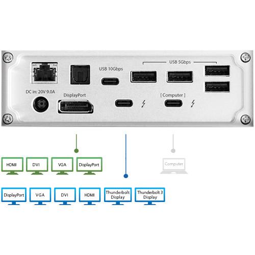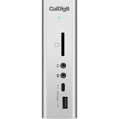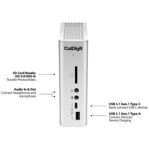 Product description Connect a variety of Thunderbolt 3, USB 3.1 Type-C, USB 3.0 Type-C, USB 3.0 Type-A, DisplayPort 1.2, Gigabit Ethernet, S/PDIF audio, 3.5mm audio, and SDXC UHS-II peripherals to your compatible system using the silver TS3 Plus 15-Port Thunderbolt 3 Dock from CalDigit. This dock contains two bi-directional 40 Gb/s Thunderbolt 3 ports, each of which utilizes the reversible USB Type-C connector and also supports 10 Gb/s USB 3.1 and dual-bandwidth DisplayPort 1.2, allowing you to connect up to two 4K/60 Hz displays simultaneously, or one 5K Thunderbolt 3 display. Additionally, you can daisy-chain up to six total devices from a single Thunderbolt 3 port. As one Thunderbolt 3 port is used to interface with your host system, the other is used for daisy chaining.