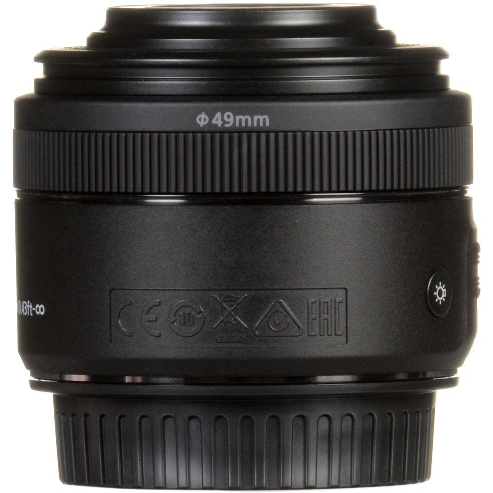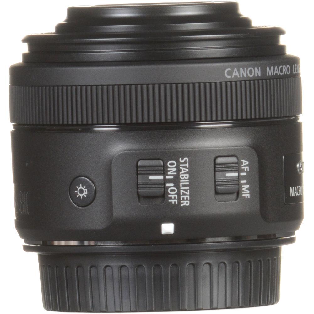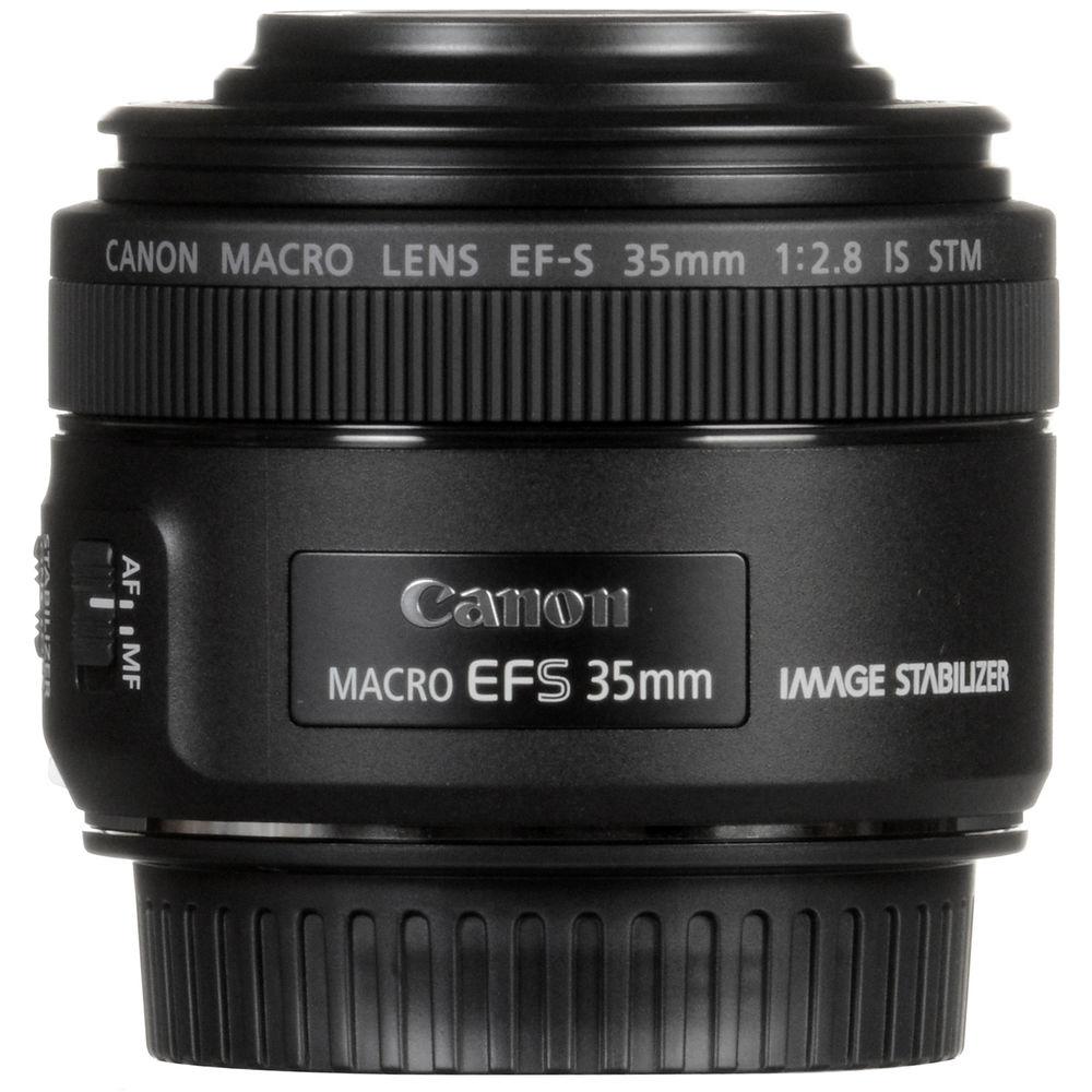 Product description Canon Announces EF-S 35mm Macro and PowerShot SX730 Camera Read More Characterized by its unique design and close-up capabilities, the EF-S 35mm f/2.8 Macro IS STM from Canon is a 56mm-equivalent prime lens designed for APS-C-format DSLRs. Offering a life-size 1:1 maximum magnification and a 5.1" minimum focusing distance, this lens further distinguishes itself with an integrated Macro Lite LED on the front of the lens to provide additional illumination to close-up subjects. Aiding its ability to reproduce small subjects at life size, the optical design incorporates one aspherical element to reduce spherical aberrations in order to provide a high degree of sharpness and clarity.