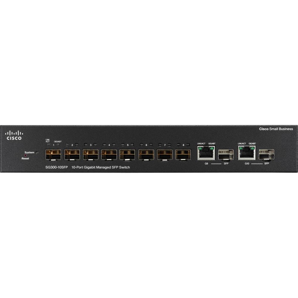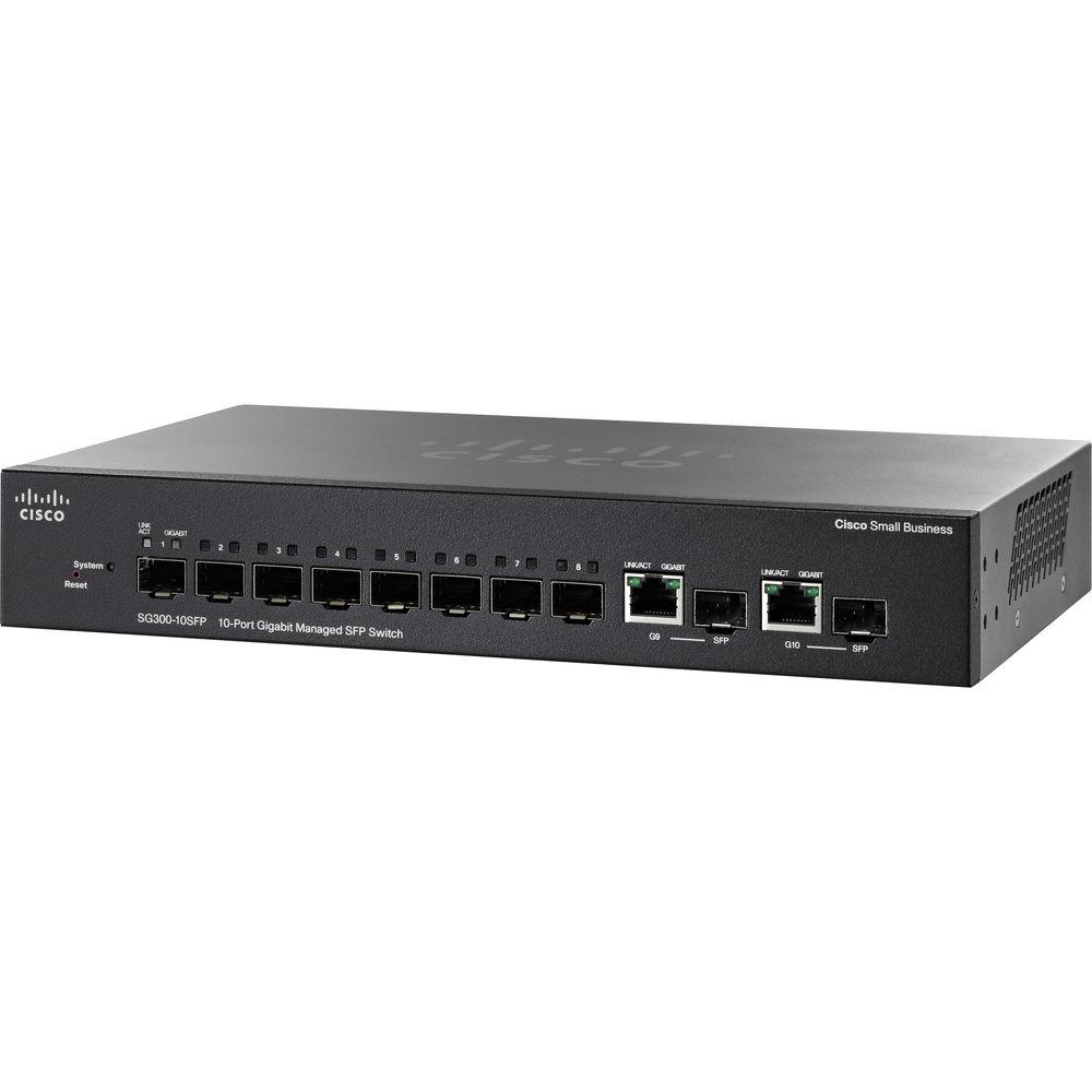Product description With Layer 3 switching support, the SG300-10SFP-K9-NA 10-Port Gigabit Ethernet Managed Switch from Cisco is designed to handle business applications and more. This switch comes equipped with 10 Gigabit SFP expansion slots allowing for high-speed network connection options. Once configured, network administrators can easily manage the network using the web-based management tool along with support for CLI, Telnet, QoS, DHCP, MIB, RMON, VLAN, Syslog, and SNMP functionality for control over various aspects of the network. UPC: 882658499319 In the Box Cisco SG300-10SFP-K9-NA 10-Port Gigabit Ethernet Managed Switch Power Cord Mounting Hardware Serial Cable Limited Lifetime Warranty Table of Contents