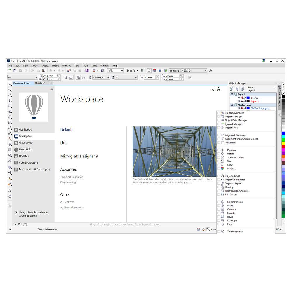 - Leverage the option of multiple displays, using one screen for illustration and 3D work, and one for documentation or additional tools. Advanced workspaces offer Lite for beginners, Technical for pros doing isometric illustrations, Diagramming for pros using flowcharts and diagrams, and the Adobe workspace for new Corel DESIGNER users coming from other applications.