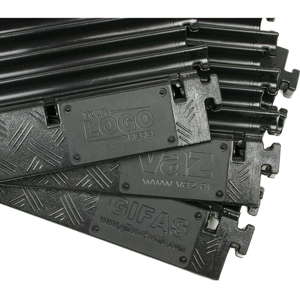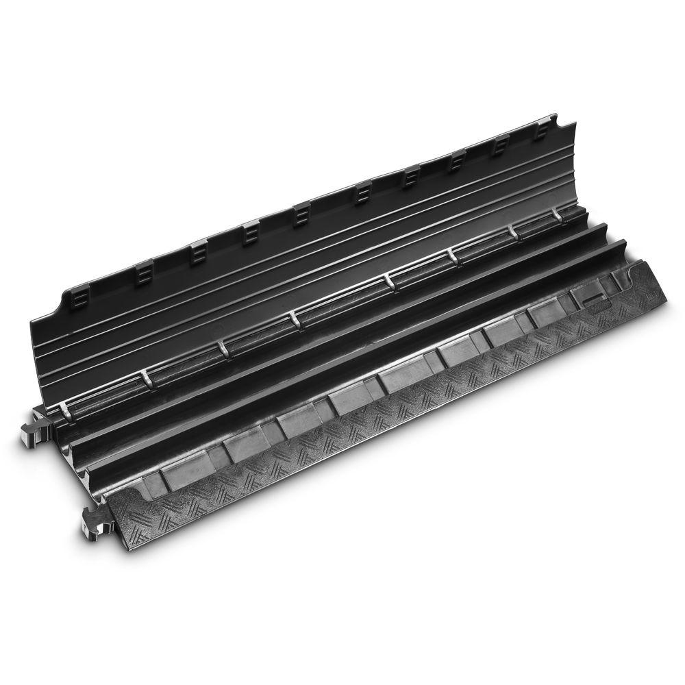 Product description The MINI 3-Channel Cable Protector with black lid by Defender is flat, easy to cross, and suitable for a wide range of indoor and outdoor applications. This cable crossover has three cable channels for neat, orderly cable routing with T-connectors for a continuous cable protection system. The Defender MINI non-slip design is made of recyclable polyurethane and provides resistance to oil, acids, solvents, petrol, and fire. The MINI can handle a load of 4000 pounds per a 7.8 x 7.8” area, making it suitable for light-duty vehicles, trolleys, and forklifts when slowly moving across this crossover. -