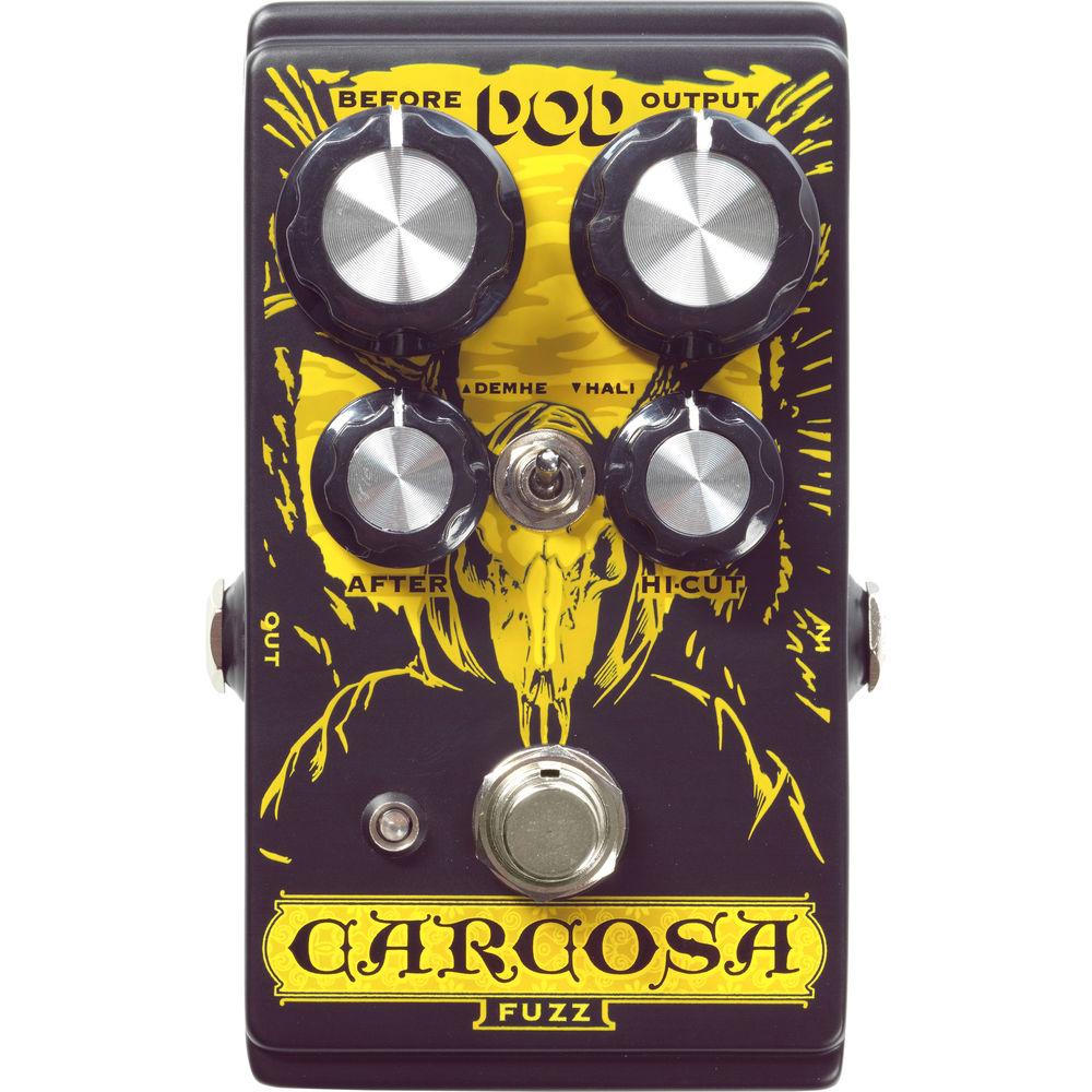 Product description DOD’s Carcosa Fuzz is a pedal intended for use with electric guitar and bass that’s designed to provide not only classic fuzz-distortion tones, but also modern fuzz timbres. The pedal accomplishes this tonal variety with two controls—the AFTER knob, which changes the texture of the distortion’s characteristics, and the DEMHE/HALI toggle switch, which changes the overall fuzzing by shaping the frequency content of the signal. Set to DEMHE, the pedal provides a bass and low-mid boost particularly suited for use in conjunction with a clean amp channel. Set to HALI, on the other hand, and the pedal cuts the bass, giving you a tone that works well in conjunction with an already dirty amp sound.The pedal features a true-bypass footswitch, so when you disengage the Carcosa, it will have no impact on your signal chain. You can power this pedal with a 9V battery (available separately) or a power adapter (also available separately). - Knobs at a Glance