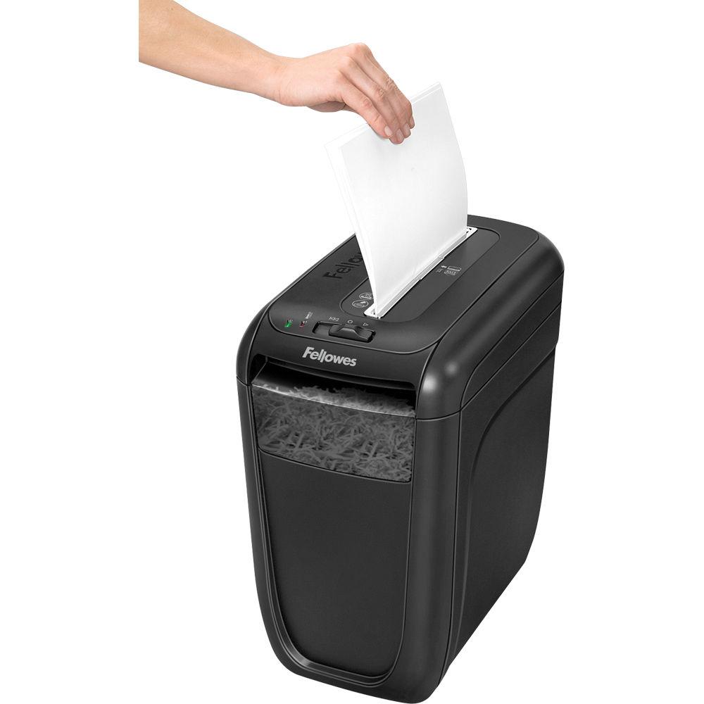 Product description The black Powershred 60Cs Cross-Cut Shredder from Fellowes enables safe and efficient disposal of confidential documents. Insert up to 10 sheets at a time into the paper entry at the top of the Powershred to reduce them into 0.16 x 2" cross-cut strips. The Powershred 60Cs is tough enough to cut through staples, paper clips, and plastic credit cards, and can shred continuously for up to six minutes before a cool down period is needed. The 6-gallon lift-off head bin allows for mess-free waste disposal. - Security Level P-3
