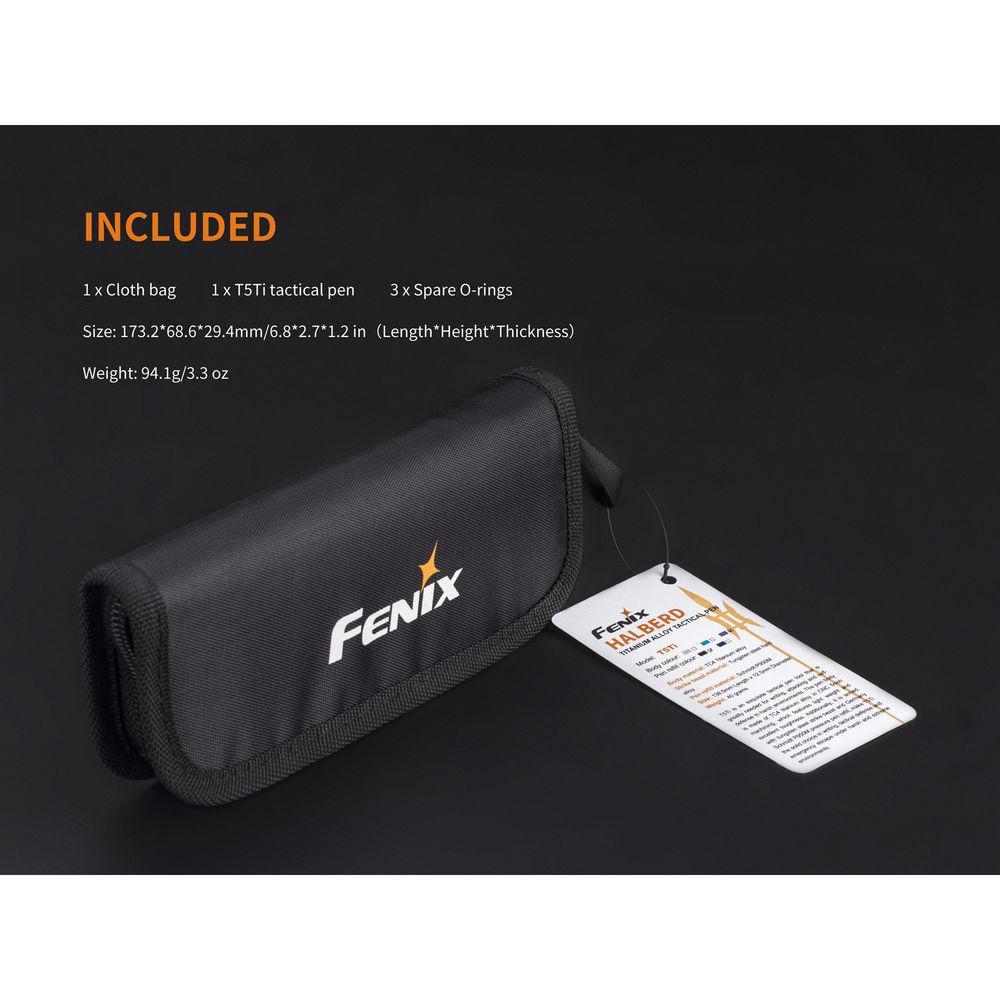 In the Box Fenix Flashlight Halberd T5Ti Tactical Pen (Aurora Purple) 3 x Spare O-Rings Zippered Carry Pouch Limited Lifetime Warranty Table of Contents
