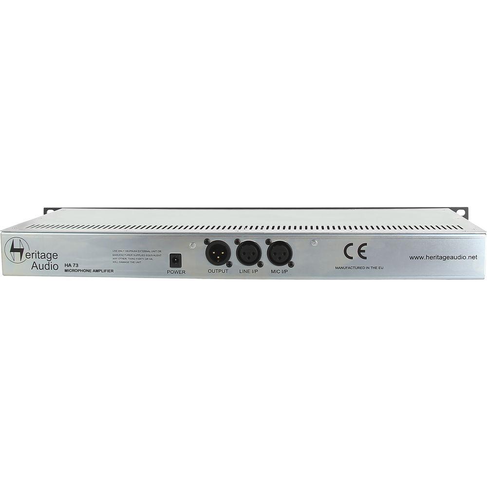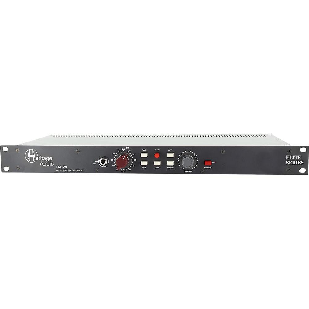Product description The Heritage Audio HA 73 is a 1 RU single-channel Elite Series microphone preamplifier designed to provide the sound of classic Neve 1073 preamps for recording engineers, musicians, and vocalists in mobile-recording rigs and home, project, and commercial studios. It features 80 dB of gain via a three-stage discrete Class-A preamp, which utilizes stepped input gain and a -20 dB pad. Hand-wound Carnhill transformers impart color and character to the output.Connect a mic or line input via balanced XLR jacks or hook up a guitar, bass, or keyboard to the integrated Hi-Z, JFET-based DI via the front-panel 1/4" jack. The selectable 82 Hz high-pass filter enables quick low-end management when rumble or proximity effect needs to be attenuated. Phantom power and input impedance are selectable and the output level is continuously variable.The HA 73 ships with an external universal power supply for worry-free use anywhere in the world. - Single-channel microphone preamplifier in a 1 RU enclosure