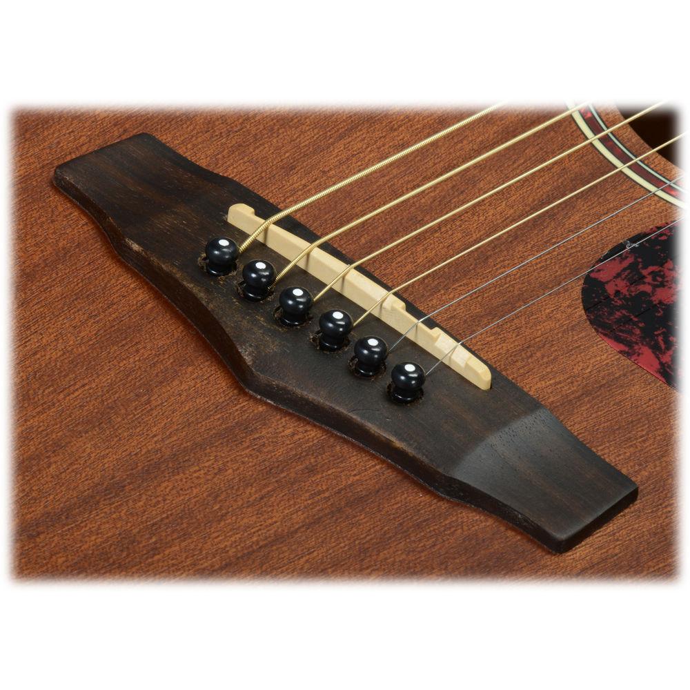Directing your eyes to the body itself, you'll notice a tortoiseshell soundhole rosette, as well as a matching tortoiseshell pickguard, which helps to prevent you from scratching the guitar's surface while playing. In addition, these features nicely complement the wood's open pore natural finish. Like the fingerboard, the bridge is also constructed from rosewood, and utilizes Ibanez Advantage bridge pins, which are tapered to keep the string's ball end positioned correctly, and have a bulb-shaped end that makes them easier to remove whenever you need to change strings. - Body Features