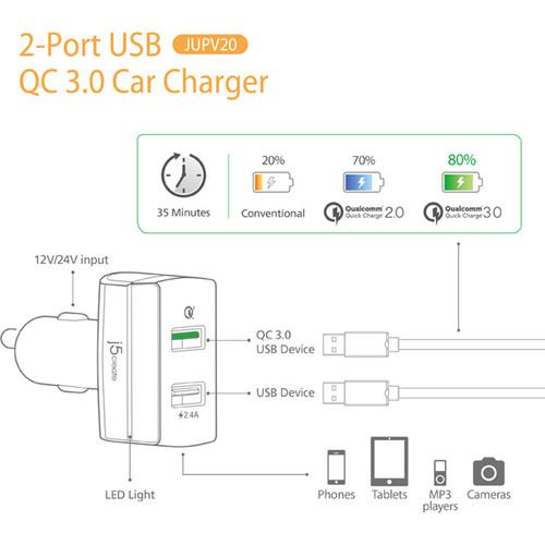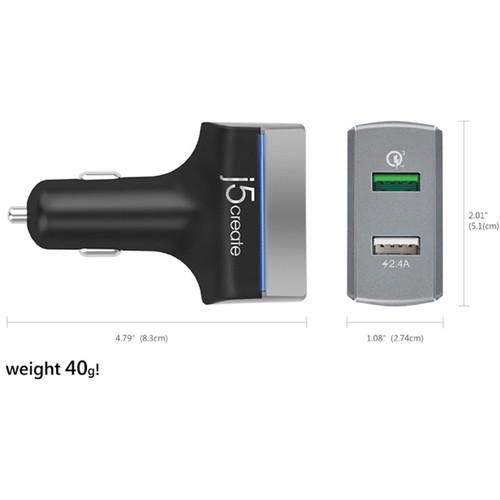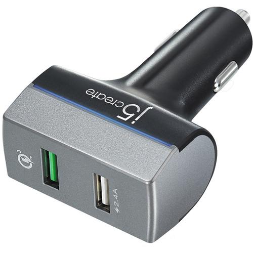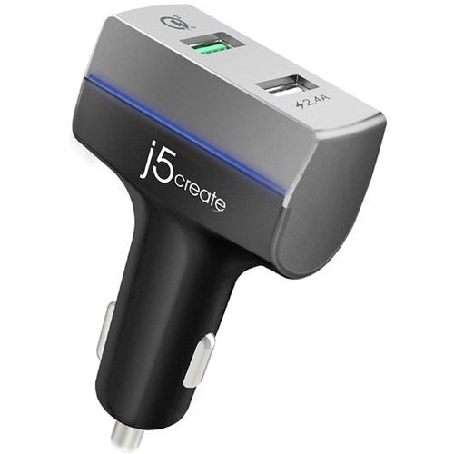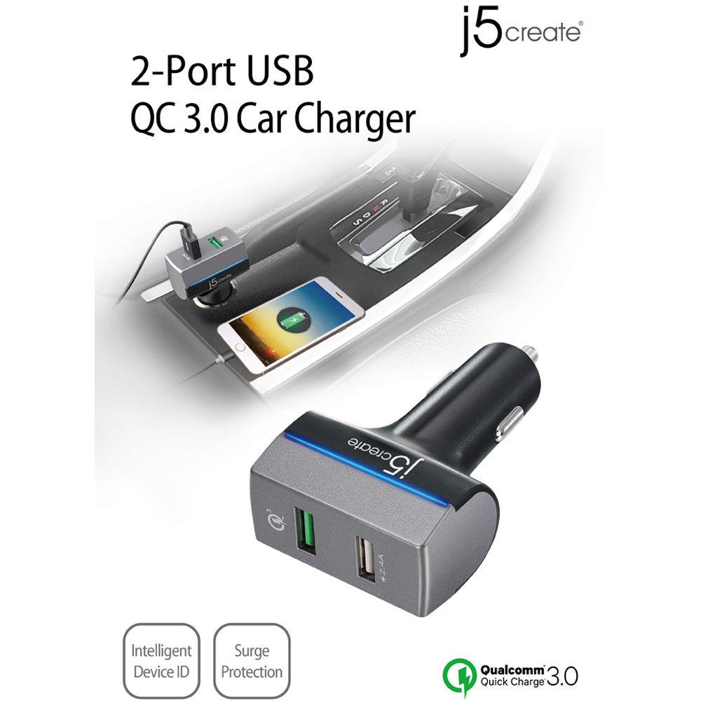 Product description Power up on the go with the j5create 2-Port USB Quick Charge 3.0 Car Charger. This charger features two USB ports, one of which is outfitted with Qualcomm's Quick Charge 3.0 technology, which replenishes the batteries of all Quick Charge-compatible devices faster than standard USB ports. Non-Quick Charge devices can be charged at up to 2.4A.