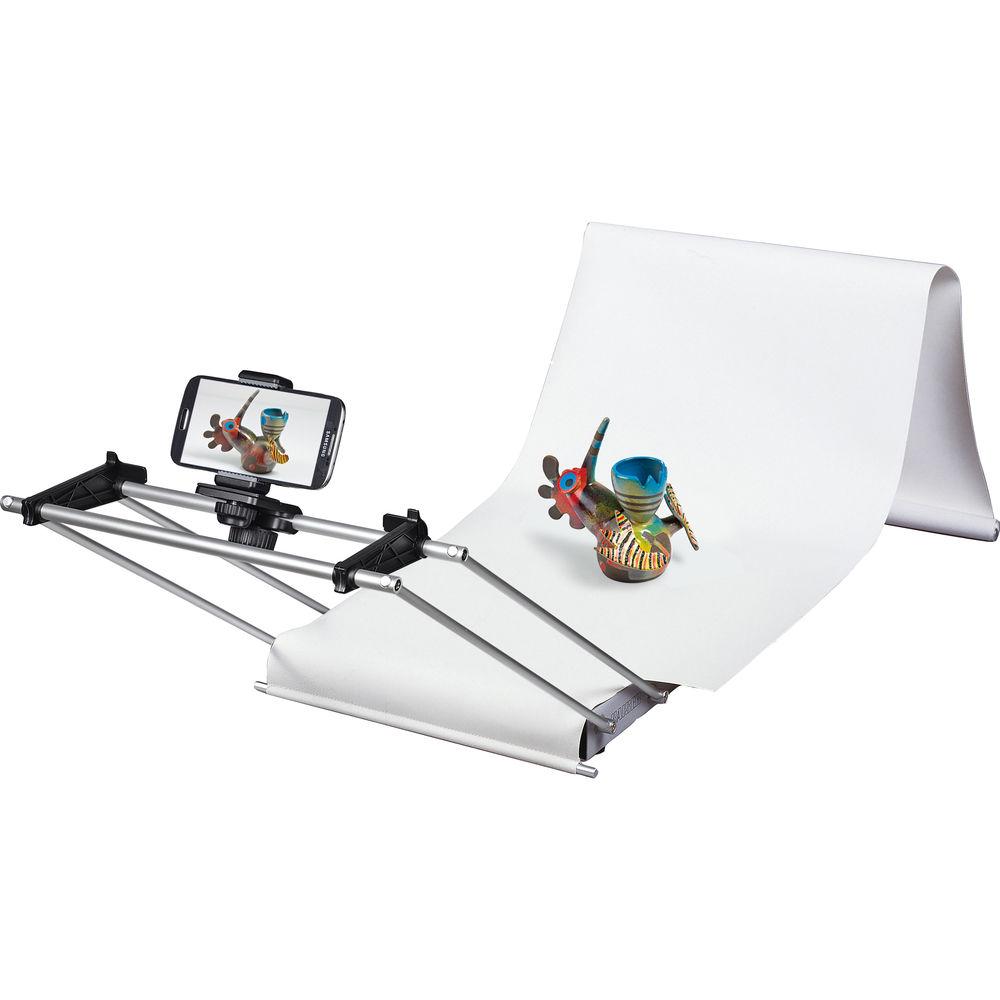 Product description Ideal for small products and ecommerce photography, the Studio-Out-of-the-Box 2.0 from Kaiser is a collapsible mini studio that folds down to 23 x 13 x 2.4". The system has a matte gray 11.8 x 17.7" table that can be extended to 29.5". The studio has a mount for cameras up to 1 lb and another to hold smartphones. Two reversible backgrounds (white/white, blue/black) measuring 15.7 x 51.2" are provided and can be elevated to various heights to suit your subject. In the Box Kaiser Studio-Out-of-the-Box 2.0 White/White Reversible Background Blue/Black Reversible Background Limited 1-Year Warranty Table of Contents