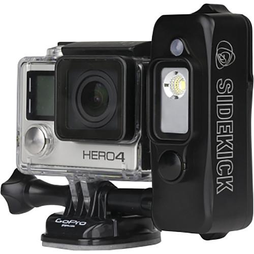 Product description The black Sidekick from Light & Motion is a compact, yet powerful LED light for the GoPro that attaches to your existing GoPro mounts, letting it accompany your camera no matter where the action takes you -- even underwater, thanks to its factory-sealed design that is waterproof to depths of 197'. Above water the light provides a 90° flood beam angle, and a 60° beam angle when underwater. To adapt to the situation at hand, the light output is adjustable from high, medium, and low output levels, with a maximum output of 600 lumens.
