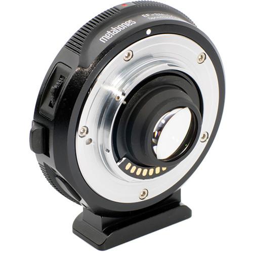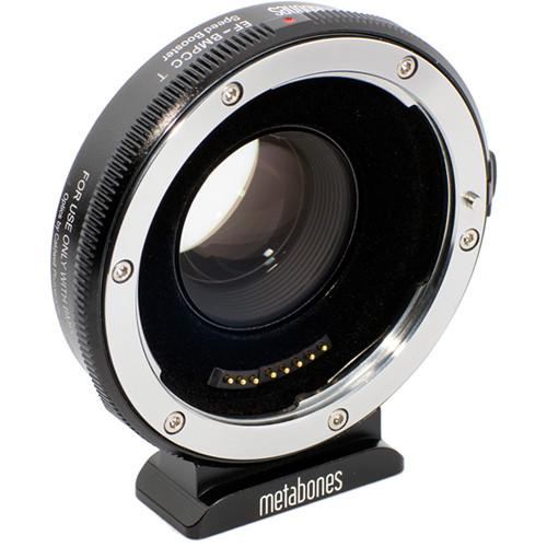 Product description The Canon EF Lens to Blackmagic Pocket Cinema Camera T Speed Booster from Metabones adapts Canon EF lenses to Micro Four Thirds mount, while using custom optics to increase the angle of view and the maximum aperture of the lens. It is designed specifically for the Blackmagic Pocket Cinema Camera and features built-in electronics which let you set the lens aperture using the controls on the camera body. The Speed Booster works by shrinking the image circle of your Canon EF lens down to better fit the smaller sensor of the Blackmagic Pocket Cinema Camera. This has the effect of making the angle of view of the lens 0.58x wider or, in other terms, reducing the crop factor of the camera from 3.02x to 1.75x. This adapter features improved internal flocking for reduced internal reflections compared to the previous version. When the Speed Booster concentrates the image circle from a lens, the brightness of the image is increased by 1 2/3 stops. This yields a maximum output aperture of f/0.74 when using a Canon EF f/1.2 lens. In addition to lens speed and angle of view, the Speed Booster also increases the lens' MTF, or how faithfully the lens transfers detail from the object to the camera sensor. These increases in MTF are seen in the corners as well as the center of the images. To reduce strain on the Pocket Camera's MFT mount, the Speed Booster includes a removable Arca-type tripod foot to help support the weight of the adapter and lens. In addition to being compatible with Arca-type quick-release heads, it also has a 1/4"-20 threaded hole for mounting to other tripods, rigs, or quick-release plates. The built-in electronics are powered by the camera body, so no additional power supply is needed. To reduce the drain on your camera's battery, the Speed Booster uses an efficient switched-mode power supply, which continually switches between on and off states, only drawing power when it needs it. Note: This Speed Booster is NOT compatible with the Panasonic GH4 or other MFT mount cameras. This is for use with Blackmagic Pocket Cinema Camera only. When the Speed Booster is used with other MFT mount cameras, its rear element may cause damage to the camera. - Supported