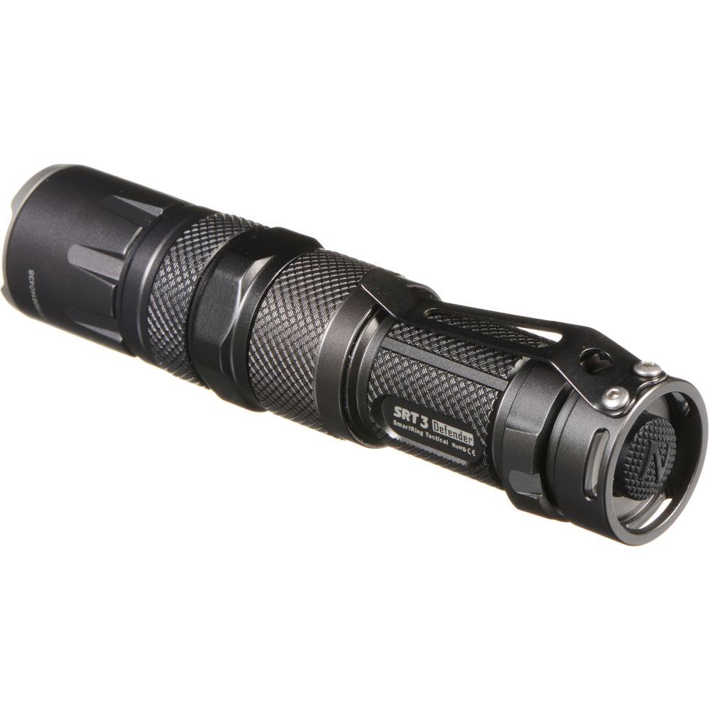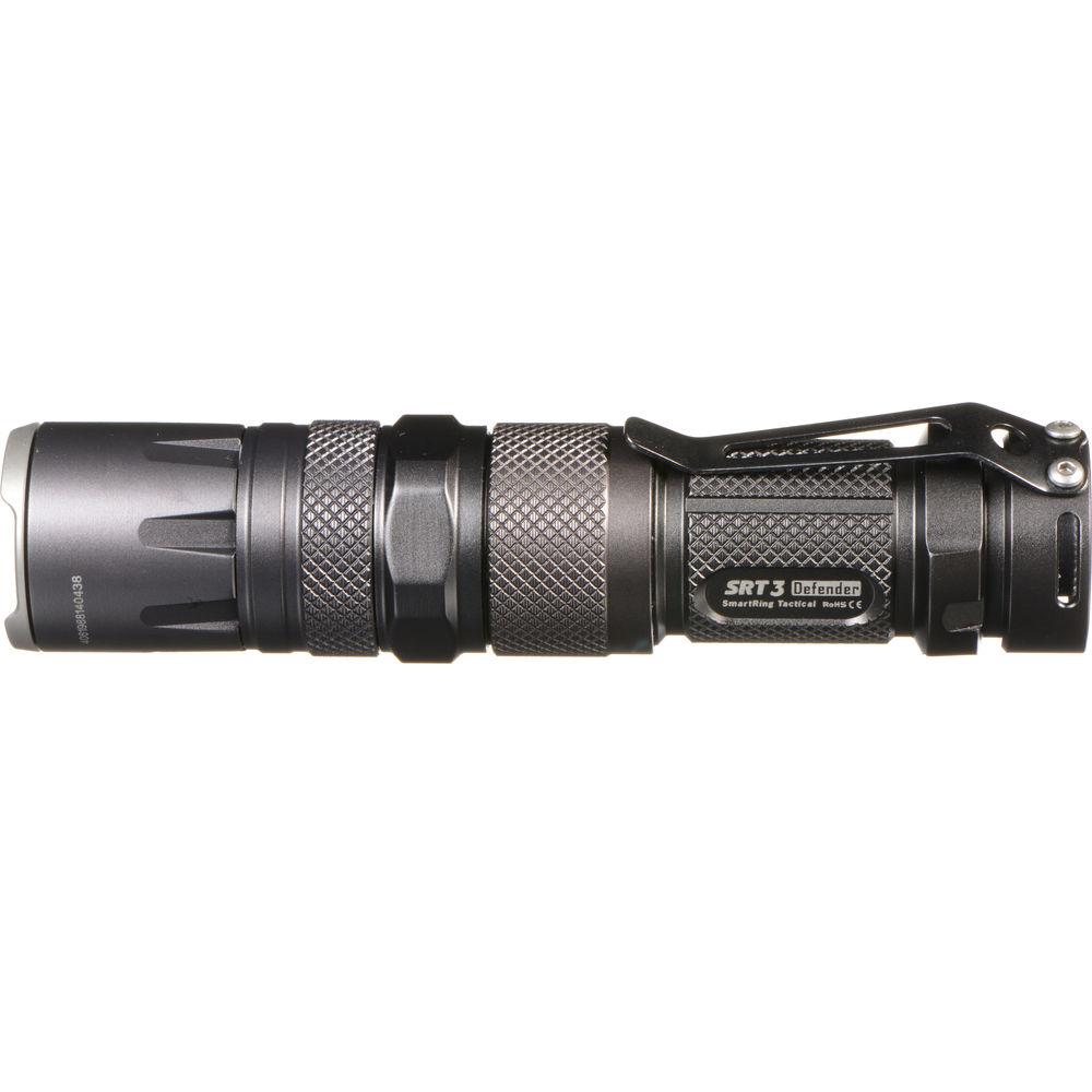 Product description The military gray SRT3 Defender Multi-Color LED Flashlight from Nitecore is a powerful and ultra-compact pocket-sized light that is built with military and law-enforcement use in mind. Its primary output comes from a white CREE XM-L2 U2 LED that is infinitely-variable from 0.1 to 550 lumens. A Red/Blue (RB) LED set on the edge of the reflector provides two colored output options for a reduced light signature that preserves night-adjusted vision. Press the 2-stage pushbutton tailcap switch for momentary activation, press and click for constant-on. The output intensity, color outputs, strobe, location beacon, SOS signal, and red/blue strobe, are managed using a magnetically-controlled rotating Smart Selector Ring located at the base of the head.Built for durability, the light features an aluminum housing with a Type III hard-anodized black finish that resists scratching and corrosion. It is O-ring sealed to be IPX8-rated and submersible to 6.6', and impact-resistant to 5 feet. Its crenellated stainless steel bezel is designed to be used for self-defense, or as a window-breaker. A diamond-textured pattern is machined into the handle to provide a sure grip, especially in cold and wet weather. The included extension tube and the specialized circuitry enable the light to run on multiple battery sizes and chemistries. This versatile light has reverse-polarity protection that prevents damage to the light's circuitry if the batteries are installed incorrectly. - Light Performance
