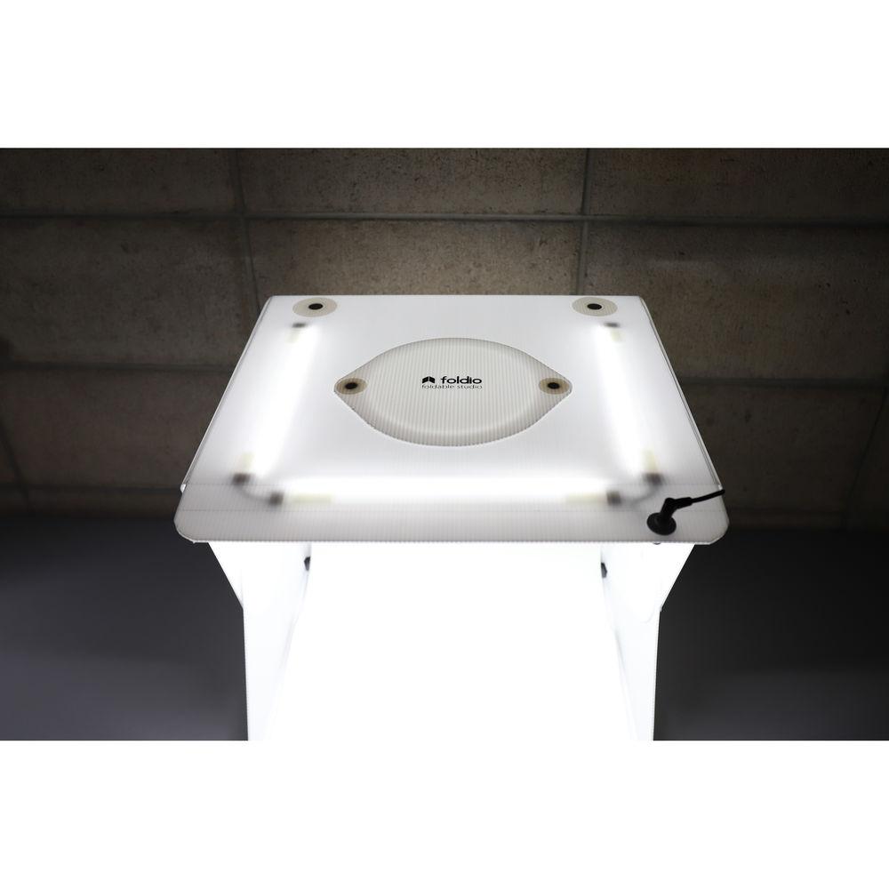 Technical parametersORANGEMONKIE Foldio2 Plus Specs | Light Source | LEDs 0.6 W / 54 chips | | Color Temperature | 5700K Daylight Balanced | | Material of Construction | Plastic sheet magnets | | Voltage | Input: 100-240 VAC, 50/60 Hz System Voltage: 19 V, 38 W | | Dimensions | Open: 15" x 15" x 15" / 38 x 38 x 38 cm Closed: 15" x 15" x 1.0" / 38 x 38 x 2.5 cm |