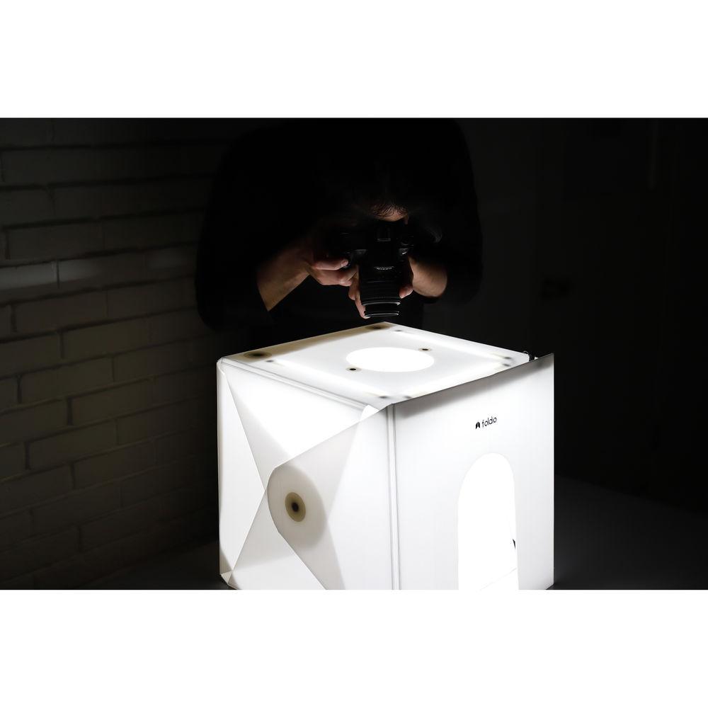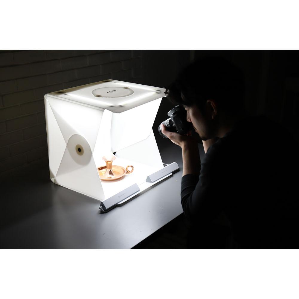 Designed for use with smartphones, tablets, DSLRs and compact cameras, the aptly named Foldio2 Plus 15" All-In-One Foldable Studio from ORANGEMONKIE is a white plastic box-like structure that measures 15 x 15 x 15" and folds down to a thickness of just one inch. It can be easily carried by its convenient handle and is useful for small products and ecommerce. The Foldio2 Plus illuminates its subjects with three daylight-balanced LED strips that have a dimmer so you can dial in the appropriate light intensity or create a ratio between the strips by dimming just one of them. The Foldio3 includes black and white backdrops to vary your images and comes with a multi-voltage AC power supply. Optional, compatible accessories include a Front cover, Halo Bar Kit, extra backdrop set, and the Foldio360 Smart Turntable. - Benefits