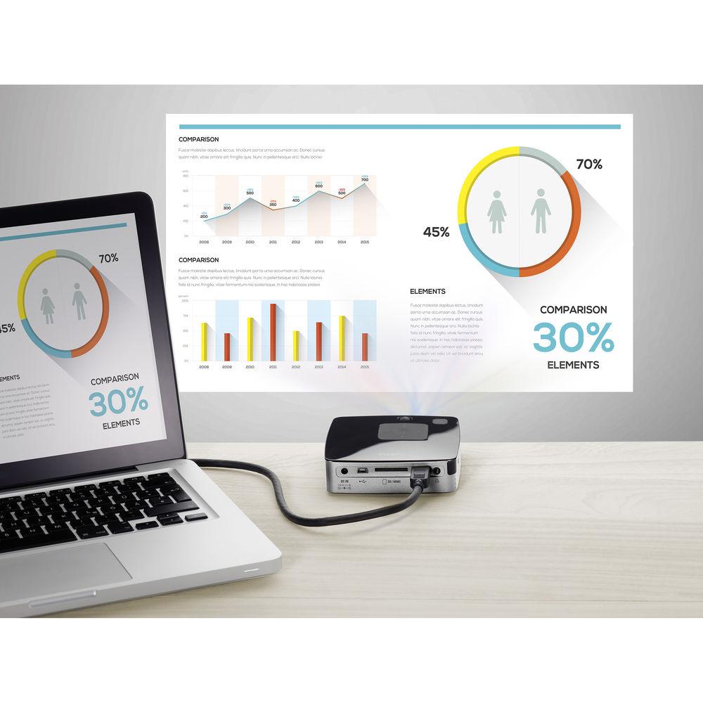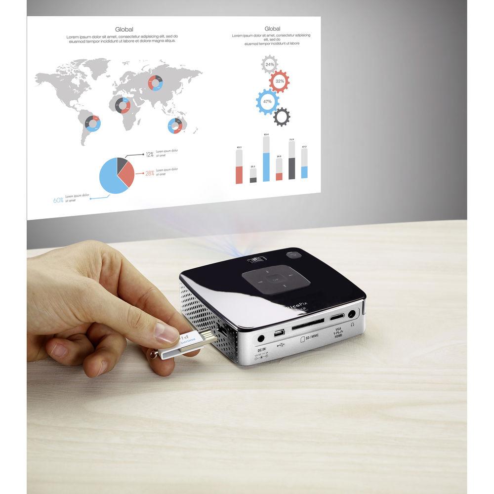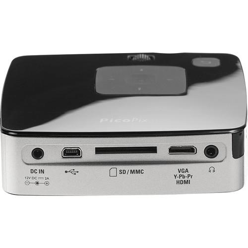 The PPX3417 has a built-in 2-hour rechargeable battery for use anywhere. It has mini-HDMI and 1/8" audio/video inputs for connecting standard- and high-definition devices, and the mini-HDMI input can also act as a VGA or component video input with separately sold adapters. Measuring only 4.1" on a side and weighing only 9.52 oz, the PicoPix is easy to tote around in its included carrying case. An HDMI cable and IR remote are also included. - Augmented Image Quality