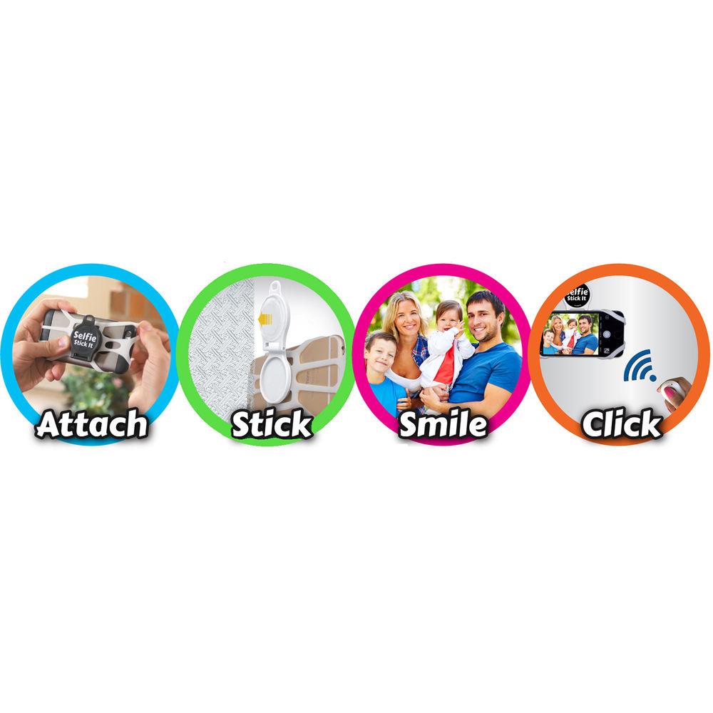 Product description The Selfie Stick-It with Bluetooth from Quik Pod is a reusable smartphone holder that sticks to almost any surface. An iOS and Android-compatible Bluetooth remote control enables you to take selfies, and to join in any group shots you capture. The compact, lightweight Selfie Stick-It snugly wraps around any size smartphone, and accommodates the use of a PopSocket on the smartphone. This white and purple Selfie Stick-It weighs approximately one ounce, and will hold your phone in either portrait or landscape mode. - Features