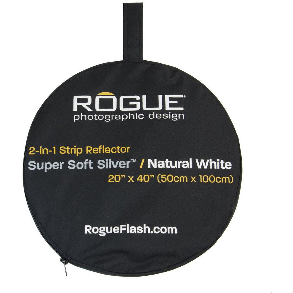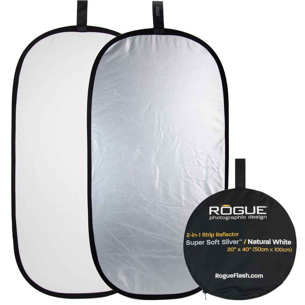 Product description The 20 x 40" Soft Silver/Natural White 2-In-1 Super Soft Collapsible Reflector from Rogue is ideal for photographers and videographers who require fill light with manageable contrast. On one side, the reversible reflector has a Super Soft Silver surface for maximum output without the high contrast and hot spot seen from shiny silver surfaces. On the other side, a Natural White surface reflects soft neutral light and is especially valuable for eliminating the blue cast that is evident in situations such as open shade. The reflector folds down to a 12" diameter for storage and transport in its soft case. - Benefits