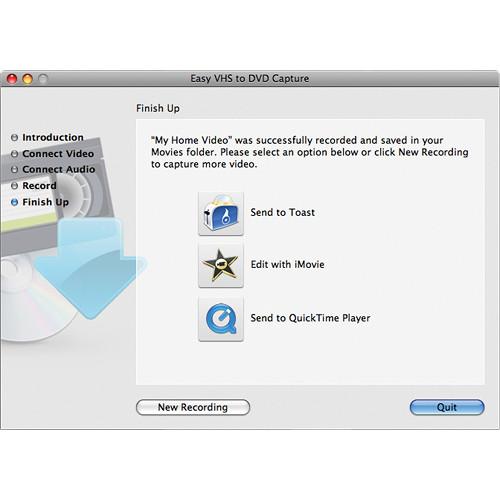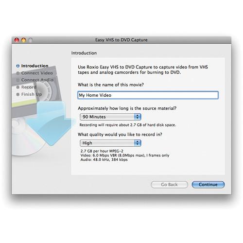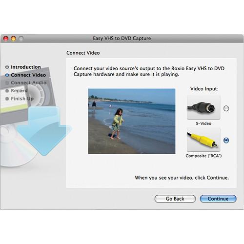 Product description Roxio's Easy VHS to DVD for Mac does just what the title says: it helps you transfer your VHS video to DVD on your Mac! More than just the included capture software this package also provides you with a capture device which is comprised of a USB extension cable, and video and audio inputs, including Composite video RCA, S-Video mini-DIN, and stereo audio RCA. To start you connect your camcorder or VCR to the included capture device using the RCA cables. You then take the capture device and connect that to your Mac. From there you capture your video using Roxio's Easy VHS to DVD Capture software and edit your files in iMovie '08 or '09. You can choose to burn you digital files to DVD as well as share them on your portable devices such as an iPod, iPhone, or PSP. - Capture