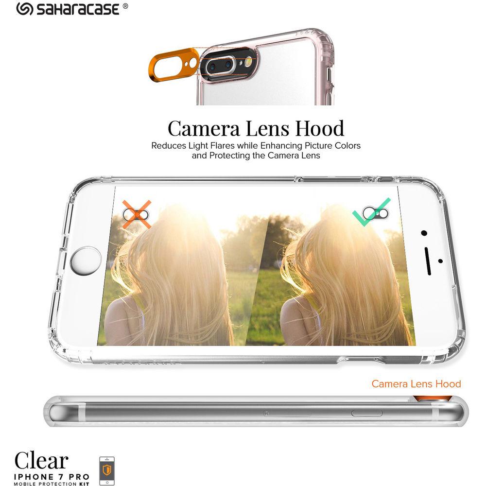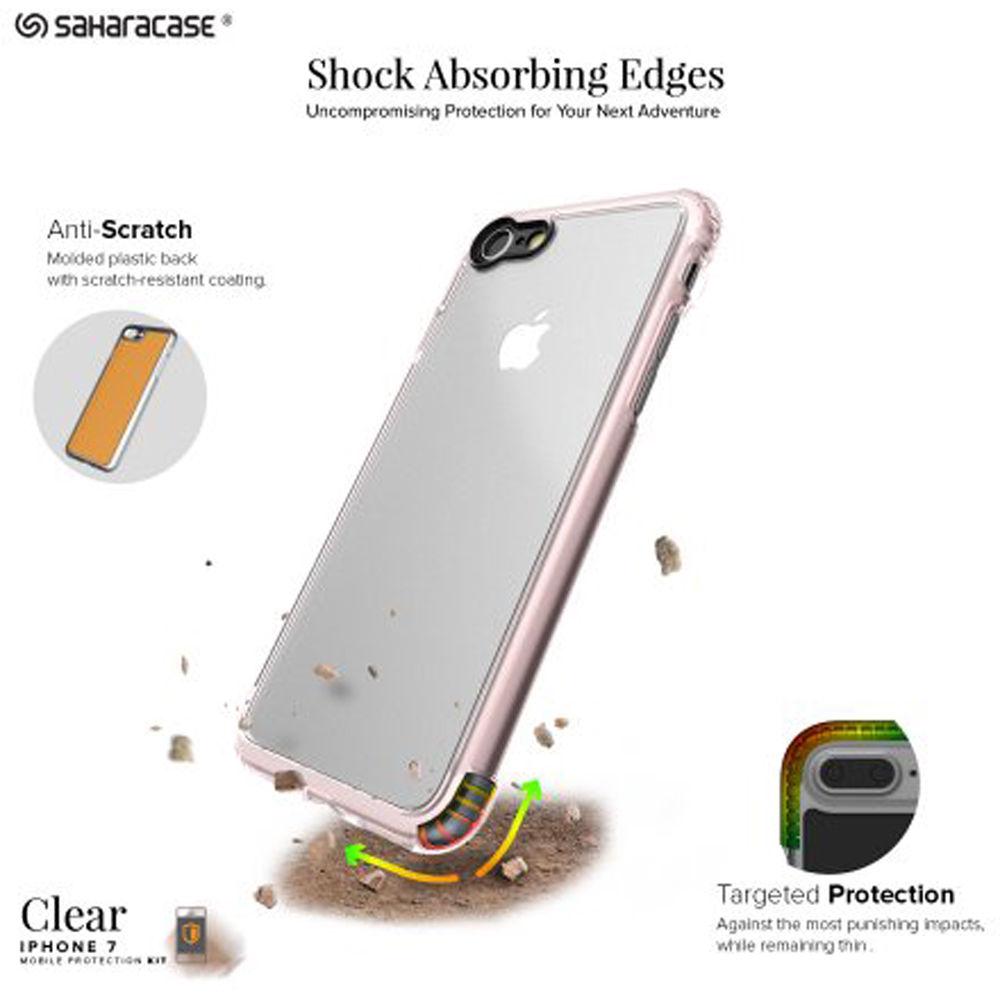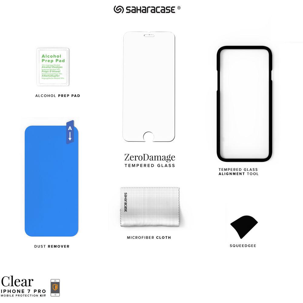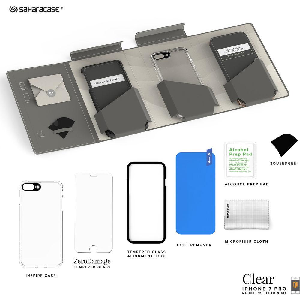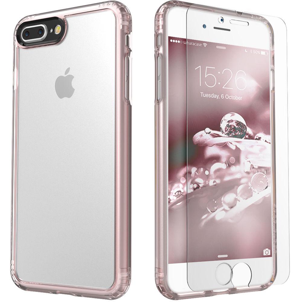 Product description Sahara Case gives you everything you need to keep your iPhone 7 Plus and 8 Plus safe and secure with the Clear Protection Kit. The case provides protection against drops and impacts without adding extra weight to your phone. This Sahara Case is manufactured from premium shock absorbing rubberized and hard plastic materials. It features a reinforced shock absorbing bumper, a raised bevel around the screen for increased protection, and precision cut-outs for easy access to buttons and ports. This case also reduces light flares while enhancing picture colors and protecting the camera lens thanks to the built-in camera lens hood.This protective kit also includes Sahara Case's ZeroDamage tempered glass screen protector to keep your iPhone's screen safe from impact and scratches while providing a smooth, glass finish without reducing touch performance or screen quality. The beveled edges offer comfort in your hand and are compatible with most cases, while retaining the original touchscreen experience with HD clarity. Your phone's display will resist fingerprint spots thanks to its oleophobic coating. UPC: 732773106701 In the Box Sahara Case Clear Protection Kit for iPhone 7 Plus and 8 Plus (Rose Gold) Clear Case ZeroDamage Tempered Glass Tempered Glass Alignment Tool Dust Remover Microfiber Cloth Alcohol Prep Pad Squeedgee Limited 1-Year Warranty Table of Contents