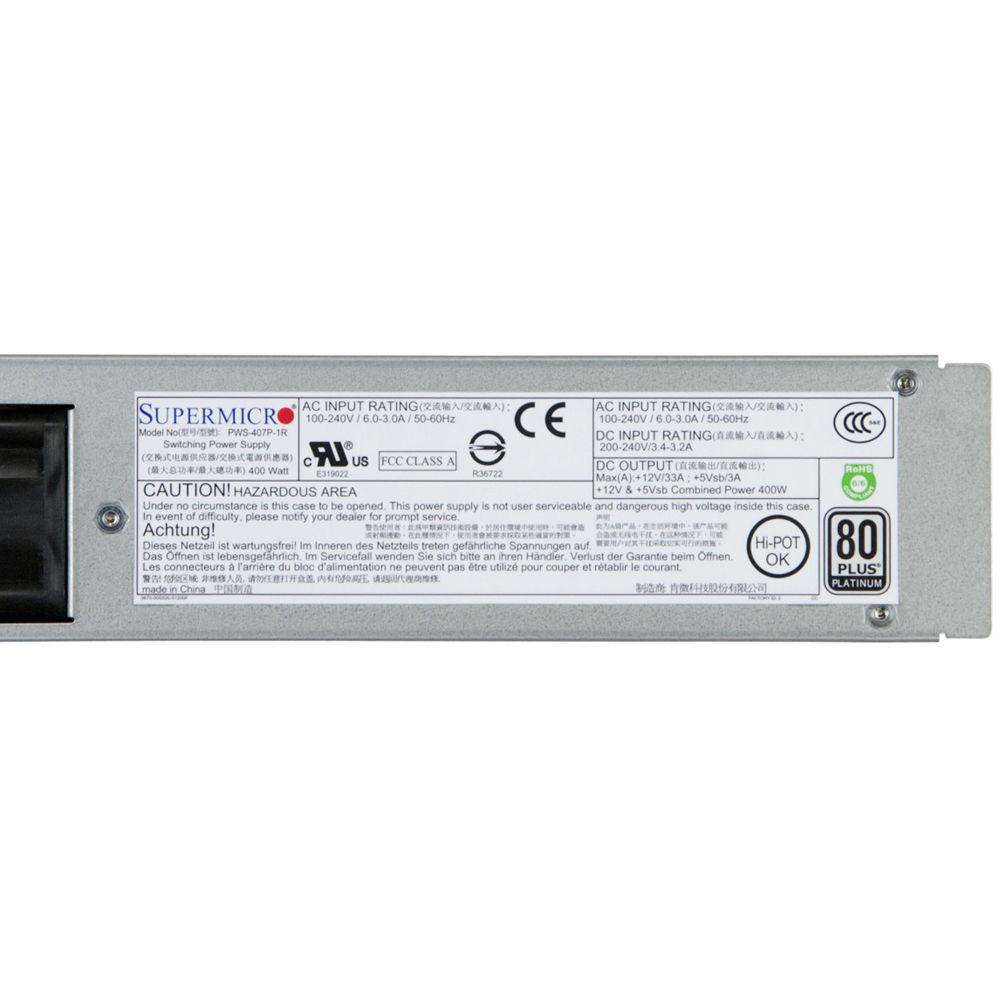 Technical parametersSupermicro PWS-407P-1R Specs | | | Device Type | Power supply - redundant - plug-in module | | Height (Rack Units) | 1U | | | | Input Voltage | AC 100-240 V | | Frequency Required | 50 - 60 Hz | | Power Capacity | 400 Watt | | Output Current | +12V - 33 A +5VSB - 3 A | | Efficiency | 85.64% at 10% Load, 93.17% at 100% Load, 92.05% at 20% Load, 94.43% at 50% Load | | 80 PLUS Certification | 80 PLUS Platinum | | | | Features | PMBus compliant | | Compliant Standards | RoHS, REACH | | | | Width | 2.1 in | | Depth | 8.7 in | | Height | 1.6 in |