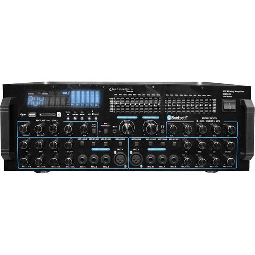 Product description Intended for settings such as concerts, school auditoriums, houses of worship and karaoke, the compact Technical Pro MM3000 Pro Mic Mixing Amp With USB, SD Card, and Bluetooth Inputs combines a powered mixer and amplifier in one. For inputs, the unit features RCA inputs for two audio sources, an auxiliary 1/8" input, a USB/SD card input, and an integrated Bluetooth v2.0 receiver with EDR. For outputs, it includes banana binding posts (4 speakers), RCA line outputs, and tape monitor loop outputs.
