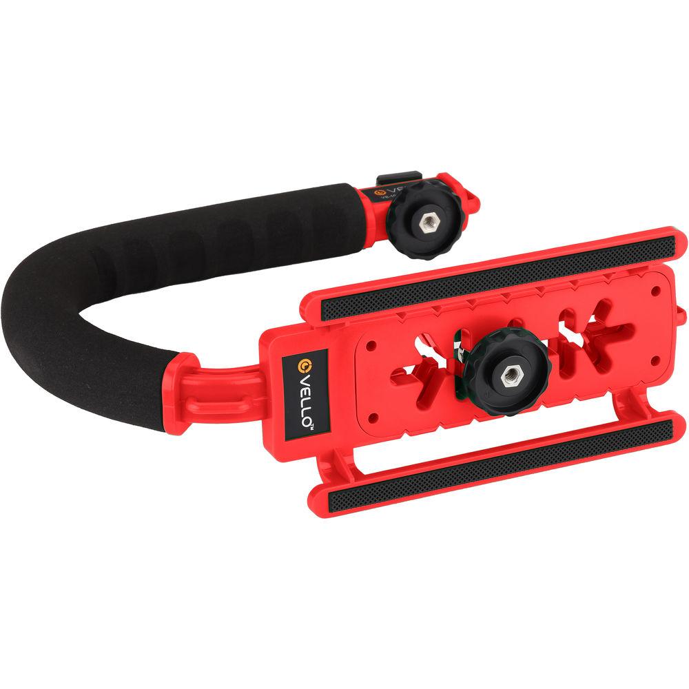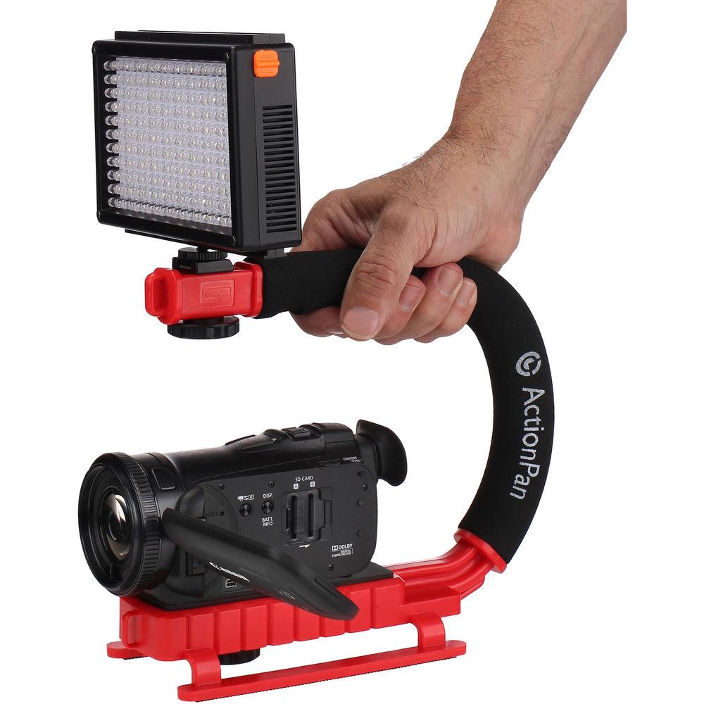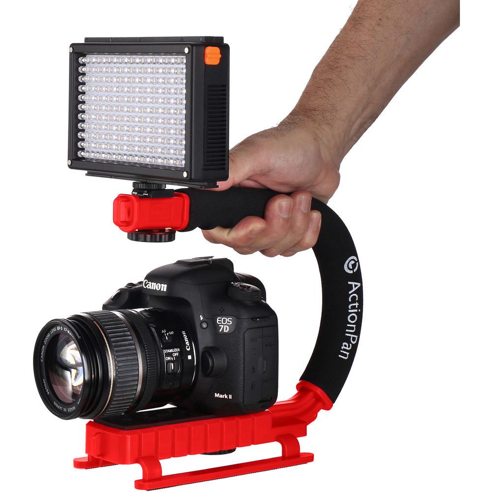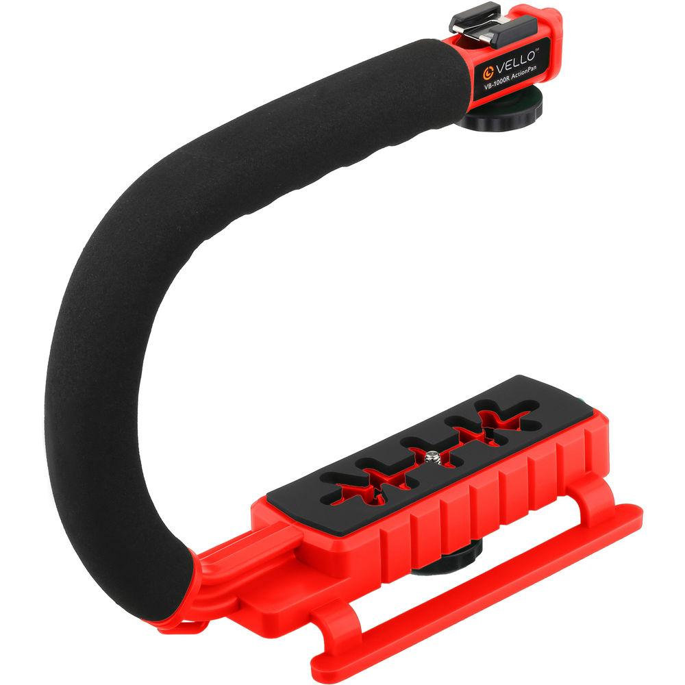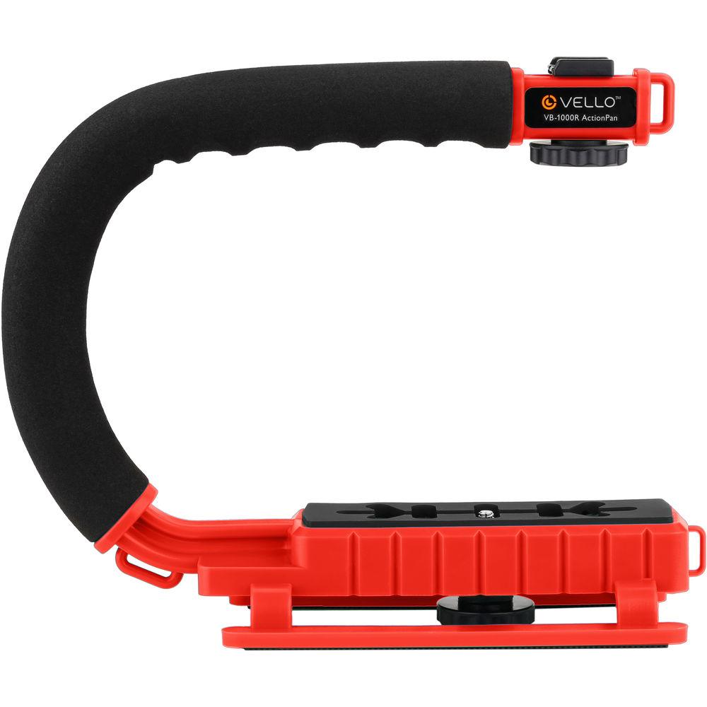 Product description The red Vello ActionPan Professional Grade Stabilizing Action Grip allows you to hold your camera down low when filming skiing, snowboarding, skateboarding, auto racing, motocross, BMX/FMX and even when boating. Besides just facilitating a novel filming perspective, the ActionPan will steady your shot as well. It can be used with most SLR cameras or camcorders (with max height of 4.5") that feature a 1/4"-20 tripod mount. The 1/4"-20 screw on the bracket is adjustable, to better accommodate cameras of different configurations. The ActionPan features a shock-proof rubber handle that alleviates stress by offering a comfortable, secure grip. There's also a finger groove for securing grip, as well as non-slip rubber rails for further securing your camera to the mount. As an added bonus, the ActionPan is equipped with a removable accessory shoe mount on the top, which can hold your video light, camera flash or external microphone. If you plan to capture action sports from any angle, especially low angles, the ActionPan is a must have. - Fits most compact cameras and camcorders with a standard 1/4"-20 mount