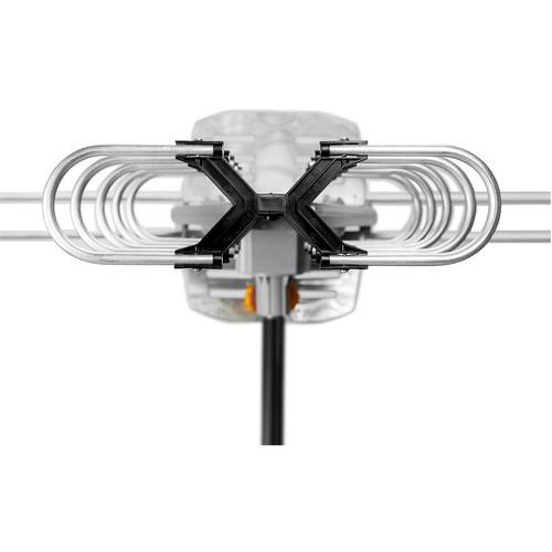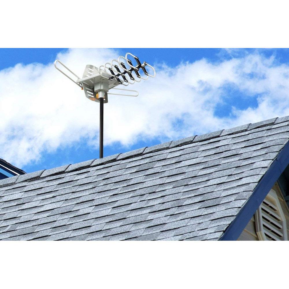Product description Receive free over-the-air (OTA) broadcast TV with the ViewTV 360° Rotating Outdoor Amplified Digital HDTV Antenna. It has a reception range of up to 150 miles and rotates 360°, allowing you to aim it to the broadcast tower of your choice. This antenna can connect to two TVs or converter boxes at a time without a splitter. Note: A mounting pole is required and sold separately. -