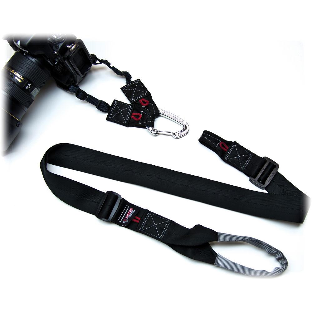 - This strap works on tension. Step on the foot loop and raise the camera to eye level. The tension created holds your camera steady