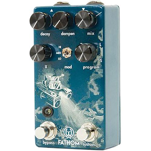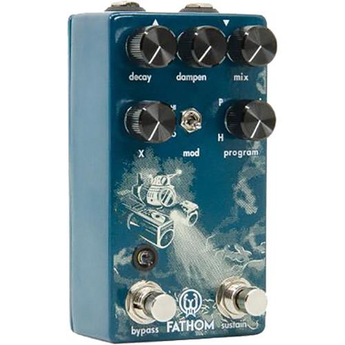 Product description Painted in an Arizona Teal finish with original artwork by Stuart Dooley, the Walrus Audio Fathom is a reverb pedal for electric guitars. It's capable of a wide array of reverberated tones thanks to its Program knob, which gives you access to four different algorithms. With this pedal, you can engage hall, plate, lo-fi, and octavized reverbs. Controls include Decay, Dampen, and Mix for blending wet signal with your dry, unprocessed tone. A Mod toggle lets you apply varying amounts of modulation to the signal, while the X knob's function changes depending on the Program knob, which changes the reverb algorithm. Two footswitches control not only bypass, but also momentary functions that come in handy for lending flavor to specific musical passages. The power supply for this pedal is available separately. - 4 Reverb Algorithms