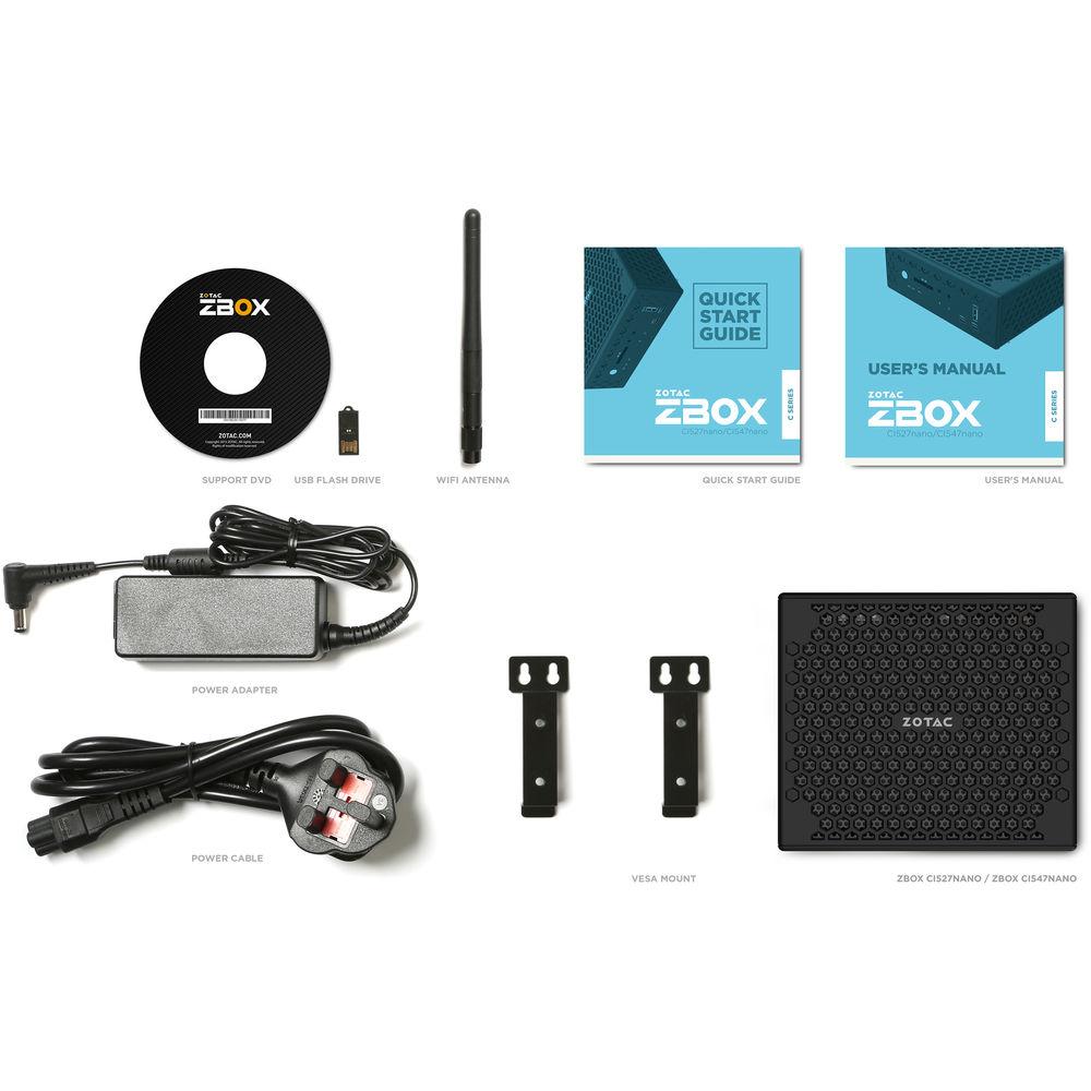 UPC: 816264017537 In the Box ZOTAC ZBOX CI527 nano Mini Desktop Computer Wi-Fi Antenna 2 x Mount Brackets 2 x Mounting Screws AC Adapter Power Cord USB Drive with OS Driver Limited 2-Year Warranty More info from ZOTAC Table of Contents